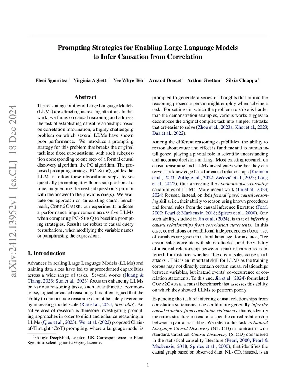 The reasoning abilities of Large Language Models (LLMs) are attracting increasing attention. In this work, we focus on causal reasoning and address the task of establishing causal relationships based on correlation information, a highly challenging problem on which several LLMs have shown poor performance. We introduce a prompting strategy for this problem that breaks the original task into fixed subquestions, with each subquestion corresponding to one step of a formal causal discovery algorithm, the PC algorithm. The proposed prompting strategy, PC-SubQ, guides the LLM to follow these algorithmic steps, by sequentially prompting it with one subquestion at a time, augmenting the next subquestion's prompt with the answer to the previous one(s). We evaluate our approach on an existing causal benchmark, Corr2Cause: our experiments indicate a performance improvement across five LLMs when comparing PC-SubQ to baseline prompting strategies. Results are robust to causal query perturbations, when modifying the variable names or paraphrasing the expressions.