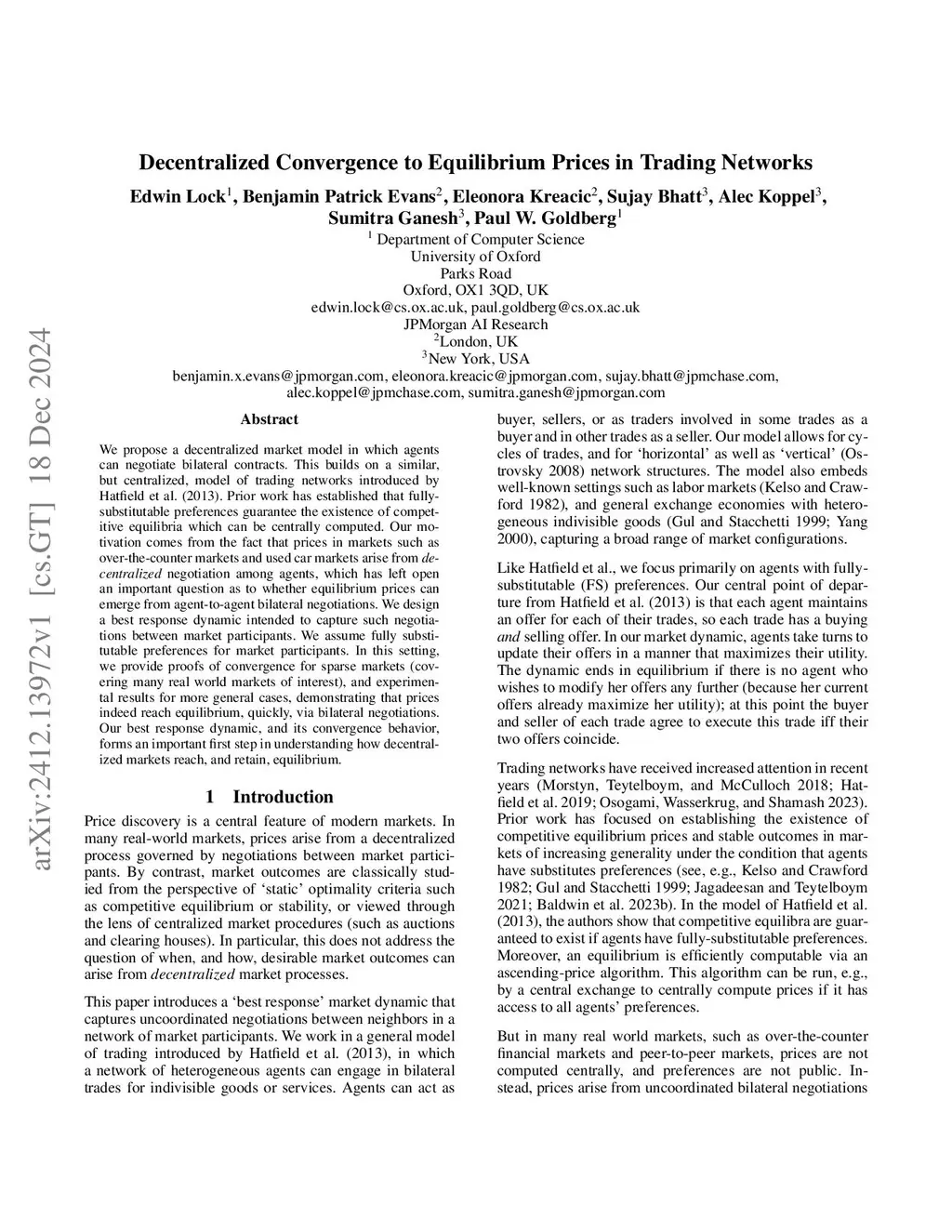 We propose a decentralized market model in which agents can negotiate bilateral contracts. This builds on a similar, but centralized, model of trading networks introduced by Hatfield et al. in 2013. Prior work has established that fully-substitutable preferences guarantee the existence of competitive equilibria which can be centrally computed. Our motivation comes from the fact that prices in markets such as over-the-counter markets and used car markets arise from decentralized negotiation among agents, which has left open an important question as to whether equilibrium prices can emerge from agent-to-agent bilateral negotiations. We design a best response dynamic intended to capture such negotiations between market participants. We assume fully substitutable preferences for market participants. In this setting, we provide proofs of convergence for sparse markets (covering many real world markets of interest), and experimental results for more general cases, demonstrating that prices indeed reach equilibrium, quickly, via bilateral negotiations. Our best response dynamic, and its convergence behavior, forms an important first step in understanding how decentralized markets reach, and retain, equilibrium.