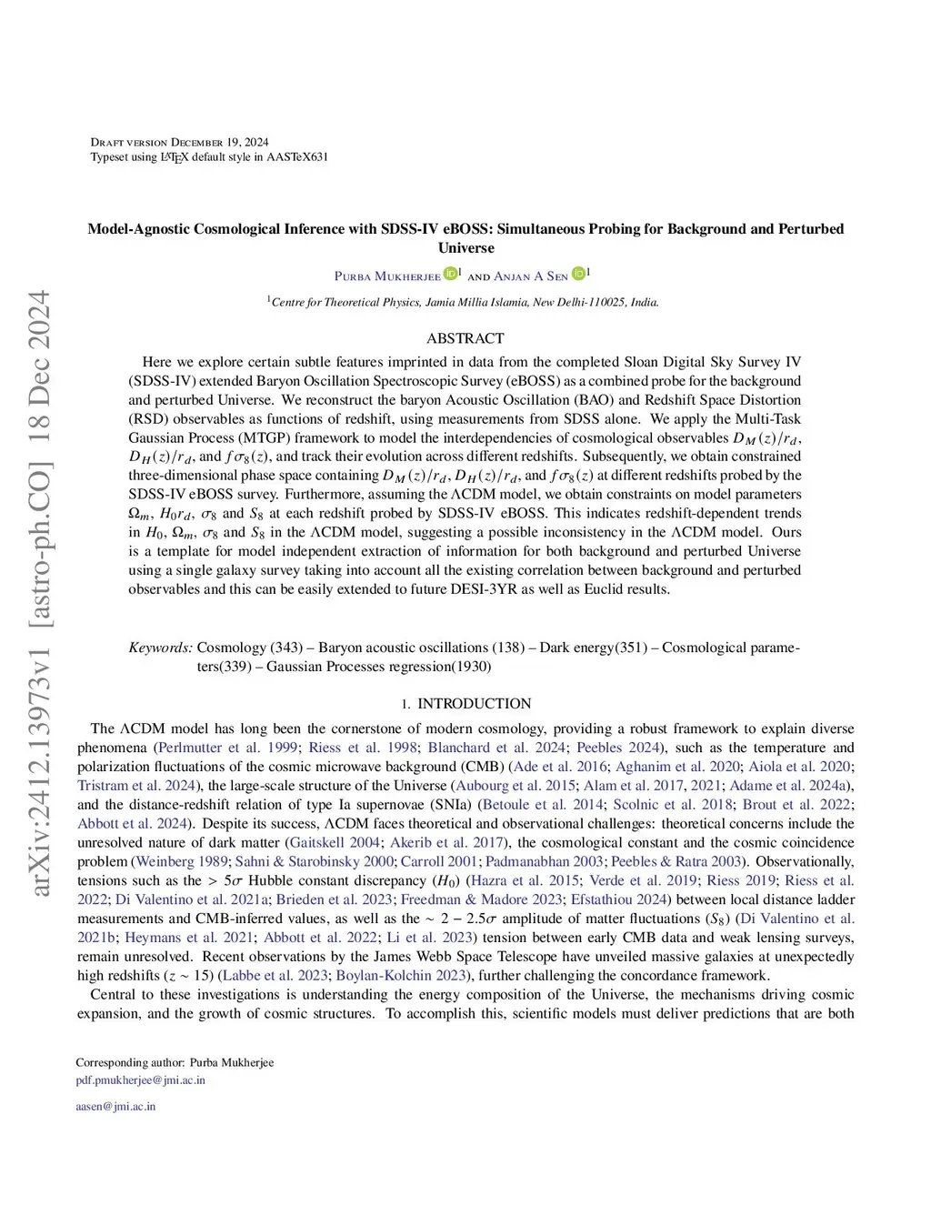 Here we explore certain subtle features imprinted in data from the completed Sloan Digital Sky Survey IV (SDSS-IV) extended Baryon Oscillation Spectroscopic Survey (eBOSS) as a combined probe for the background and perturbed Universe. We reconstruct the baryon Acoustic Oscillation (BAO) and Redshift Space Distortion (RSD) observables as functions of redshift, using measurements from SDSS alone. We apply the Multi-Task Gaussian Process (MTGP) framework to model the interdependencies of cosmological observables , , and , and track their evolution across different redshifts. Subsequently, we obtain constrained three-dimensional phase space containing , , and at different redshifts probed by the SDSS-IV eBOSS survey. Furthermore, assuming the CDM model, we obtain constraints on model parameters , , and at each redshift probed by SDSS-IV eBOSS. This indicates redshift-dependent trends in , , and in the CDM model, suggesting a possible inconsistency in the CDM model. Ours is a template for model-independent extraction of information for both background and perturbed Universe using a single galaxy survey taking into account all the existing correlations between background and perturbed observables and this can be easily extended to future DESI-3YR as well as Euclid results.