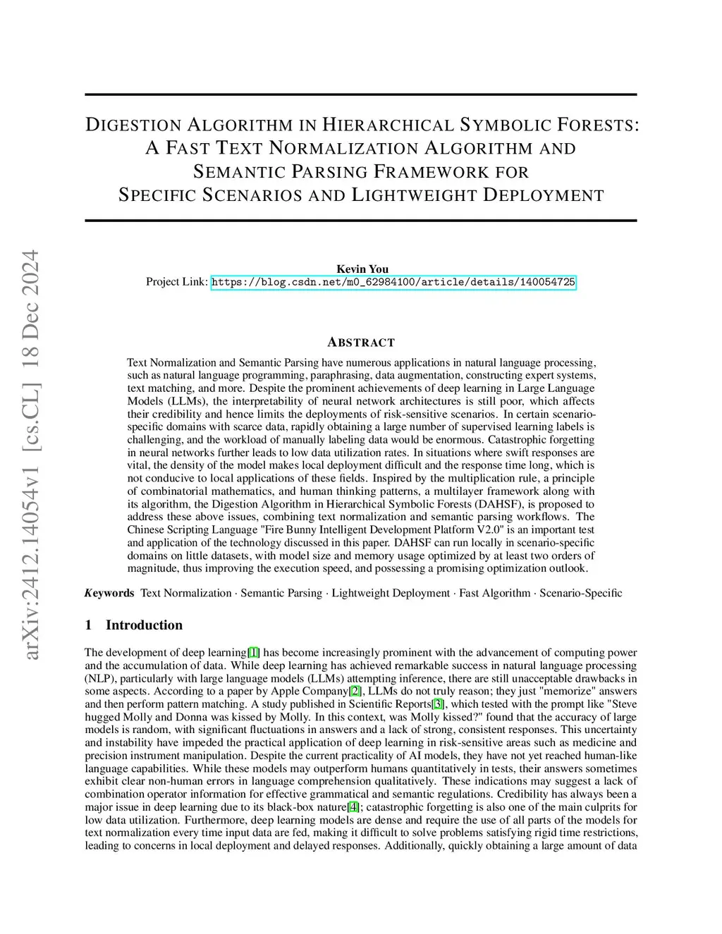 Text Normalization and Semantic Parsing have numerous applications in natural language processing, such as natural language programming, paraphrasing, data augmentation, constructing expert systems, text matching, and more. Despite the prominent achievements of deep learning in Large Language Models (LLMs), the interpretability of neural network architectures is still poor, which affects their credibility and hence limits the deployments of risk-sensitive scenarios. In certain scenario-specific domains with scarce data, rapidly obtaining a large number of supervised learning labels is challenging, and the workload of manually labeling data would be enormous. Catastrophic forgetting in neural networks further leads to low data utilization rates. In situations where swift responses are vital, the density of the model makes local deployment difficult and the response time long, which is not conducive to local applications of these fields. Inspired by the multiplication rule, a principle of combinatorial mathematics, and human thinking patterns, a multilayer framework along with its algorithm, the Digestion Algorithm in Hierarchical Symbolic Forests (DAHSF), is proposed to address these above issues, combining text normalization and semantic parsing workflows. The Chinese Scripting Language "Fire Bunny Intelligent Development Platform V2.0" is an important test and application of the technology discussed in this paper. DAHSF can run locally in scenario-specific domains on little datasets, with model size and memory usage optimized by at least two orders of magnitude, thus improving the execution speed, and possessing a promising optimization outlook.