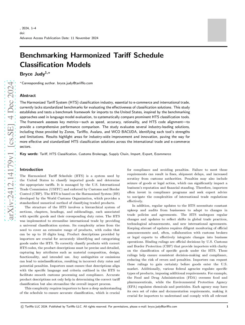 The Harmonized Tariff System (HTS) classification industry, essential to e-commerce and international trade, currently lacks standardized benchmarks for evaluating the effectiveness of classification solutions. This study establishes and tests a benchmark framework for imports to the United States, inspired by the benchmarking approaches used in language model evaluation, to systematically compare prominent HTS classification tools. The framework assesses key metrics--such as speed, accuracy, rationality, and HTS code alignment--to provide a comprehensive performance comparison. The study evaluates several industry-leading solutions, including those provided by Zonos, Tarifflo, Avalara, and WCO BACUDA, identifying each tool's strengths and limitations. Results highlight areas for industry-wide improvement and innovation, paving the way for more effective and standardized HTS classification solutions across the international trade and e-commerce sectors.