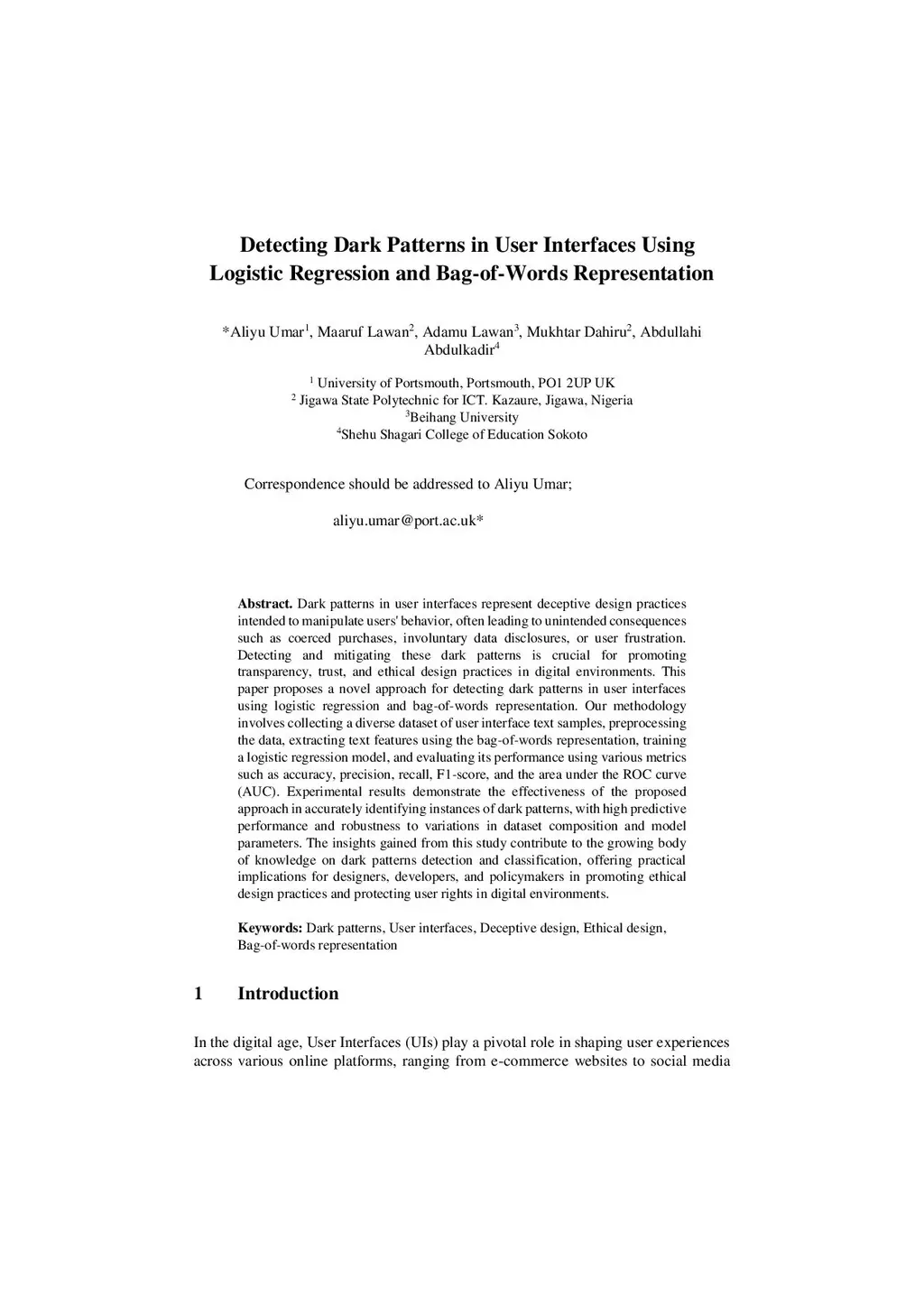 Detecting Dark Patterns in User Interfaces Using Logistic Regression and