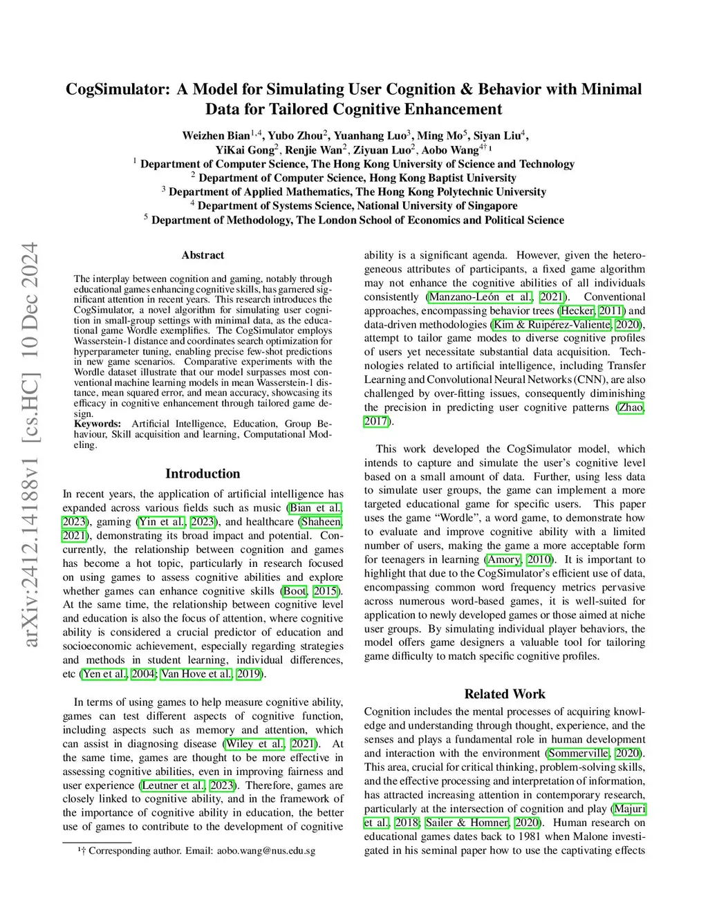 The interplay between cognition and gaming, notably through educational games enhancing cognitive skills, has garnered significant attention in recent years. This research introduces the CogSimulator, a novel algorithm for simulating user cognition in small-group settings with minimal data, as the educational game Wordle exemplifies. The CogSimulator employs Wasserstein-1 distance and coordinates search optimization for hyperparameter tuning, enabling precise few-shot predictions in new game scenarios. Comparative experiments with the Wordle dataset illustrate that our model surpasses most conventional machine learning models in mean Wasserstein-1 distance, mean squared error, and mean accuracy, showcasing its efficacy in cognitive enhancement through tailored game design.