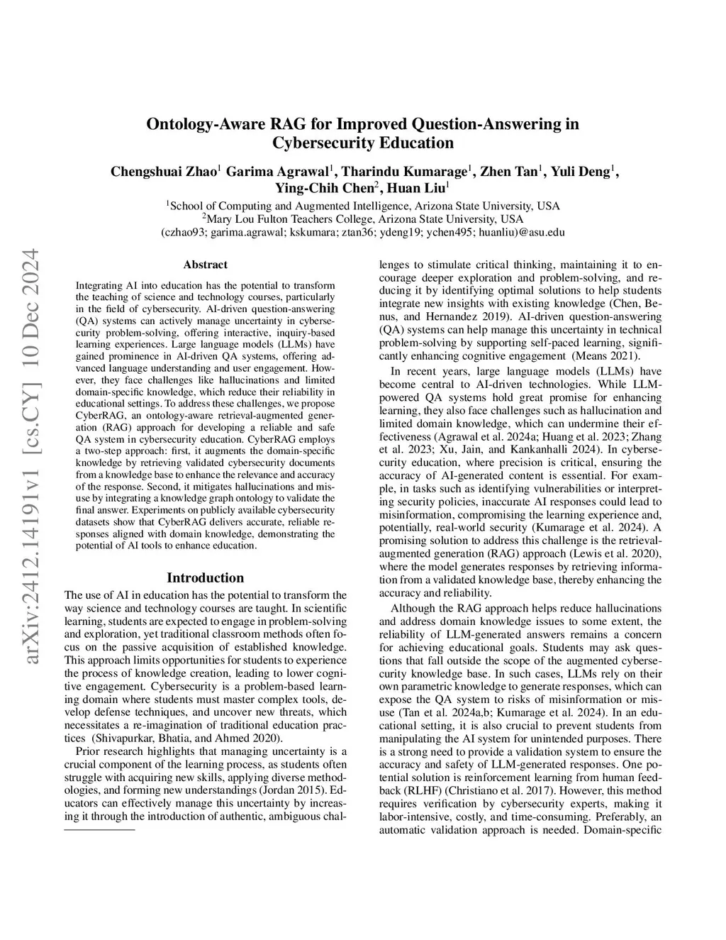 Integrating AI into education has the potential to transform the teaching of science and technology courses, particularly in the field of cybersecurity. AI-driven question-answering (QA) systems can actively manage uncertainty in cybersecurity problem-solving, offering interactive, inquiry-based learning experiences. Recently, Large language models (LLMs) have gained prominence in AI-driven QA systems, enabling advanced language understanding and user engagement. However, they face challenges like hallucinations and limited domain-specific knowledge, which reduce their reliability in educational settings. To address these challenges, we propose CyberRAG, an ontology-aware retrieval-augmented generation (RAG) approach for developing a reliable and safe QA system in cybersecurity education. CyberRAG employs a two-step approach: first, it augments the domain-specific knowledge by retrieving validated cybersecurity documents from a knowledge base to enhance the relevance and accuracy of the response. Second, it mitigates hallucinations and misuse by integrating a knowledge graph ontology to validate the final answer. Comprehensive experiments on publicly available datasets reveal that CyberRAG delivers accurate, reliable responses aligned with domain knowledge, demonstrating the potential of AI tools to enhance education.