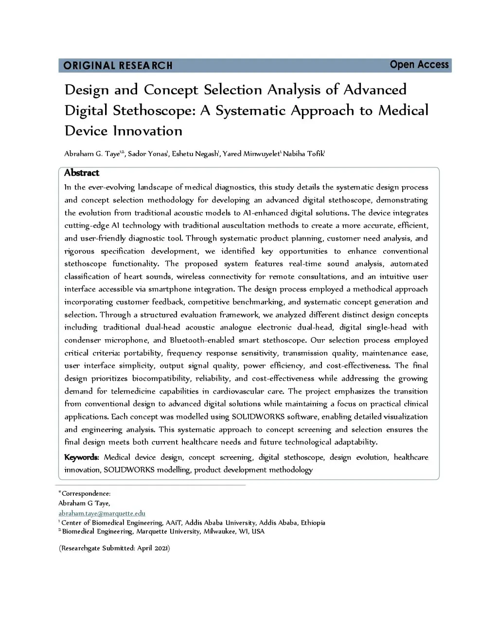 In the ever-evolving landscape of medical diagnostics, this study details the systematic design process and concept selection methodology for developing an advanced digital stethoscope, demonstrating the evolution from traditional acoustic models to AI-enhanced digital solutions. The device integrates cutting-edge AI technology with traditional auscultation methods to create a more accurate, efficient, and user-friendly diagnostic tool. Through systematic product planning, customer need analysis, and rigorous specification development, we identified key opportunities to enhance conventional stethoscope functionality. The proposed system features real-time sound analysis, automated classification of heart sounds, wireless connectivity for remote consultations, and an intuitive user interface accessible via smartphone integration. The design process employed a methodical approach incorporating customer feedback, competitive benchmarking, and systematic concept generation and selection. Through a structured evaluation framework, we analyzed portability, frequency response sensitivity, transmission quality, maintenance ease, user interface simplicity, output signal quality, power efficiency, and cost-effectiveness. The final design prioritizes biocompatibility, reliability, and cost-effectiveness while addressing the growing demand for telemedicine capabilities in cardiovascular care. The project emphasizes the transition from conventional design to advanced digital solutions while maintaining a focus on practical clinical applications. Each concept was modelled using SOLIDWORKS software, enabling detailed visualization and engineering analysis. This systematic approach to concept screening and selection ensures the final design meets both current healthcare needs and future technological adaptability.