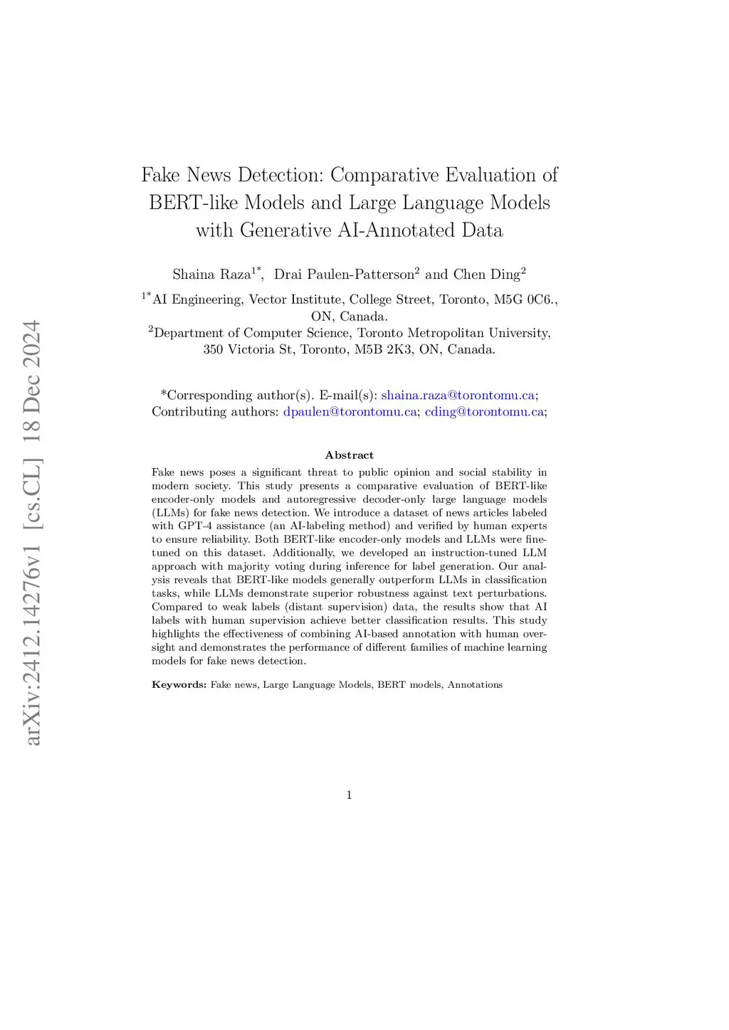 Fake news poses a significant threat to public opinion and social stability in modern society. This study presents a comparative evaluation of BERT-like encoder-only models and autoregressive decoder-only large language models (LLMs) for fake news detection. We introduce a dataset of news articles labeled with GPT-4 assistance (an AI-labeling method) and verified by human experts to ensure reliability. Both BERT-like encoder-only models and LLMs were fine-tuned on this dataset. Additionally, we developed an instruction-tuned LLM approach with majority voting during inference for label generation. Our analysis reveals that BERT-like models generally outperform LLMs in classification tasks, while LLMs demonstrate superior robustness against text perturbations. Compared to weak labels (distant supervision) data, the results show that AI labels with human supervision achieve better classification results. This study highlights the effectiveness of combining AI-based annotation with human oversight and demonstrates the performance of different families of machine learning models for fake news detection