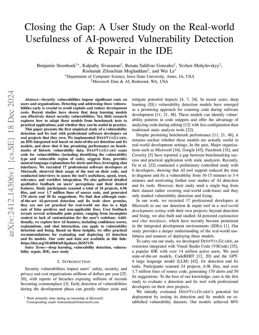 Closing the Gap: A User Study on the Real-world Usefulness of AI-powered Vulnerability Detection & Repair in the IDE