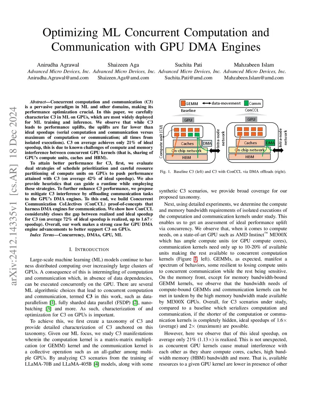 Concurrent computation and communication (C3) is a pervasive paradigm in ML and other domains, making its performance optimization crucial. In this paper, we carefully characterize C3 in ML on GPUs, which are most widely deployed for ML training and inference. We observe that while C3 leads to performance uplifts, the uplifts are far lower than ideal speedups (serial computation and communication versus maximum of computation or communication; all times from isolated executions). C3 on average achieves only 21% of ideal speedup, this is due to known challenges of compute and memory interference between concurrent GPU kernels (that is, sharing of GPU's compute units, caches and HBM). To attain better performance for C3, first, we evaluate dual strategies of schedule prioritization and careful resource partitioning of compute units on GPUs to push performance attained with C3 (on average 42% of ideal speedup). We also provide heuristics that can guide a runtime while employing these strategies. To further enhance C3 performance, we propose to mitigate C3 interference by offloading communication tasks to the GPU's DMA engines. To this end, we build Concurrent Communication CoLlectives (ConCCL) proof-of-concepts that harness DMA engines for communication. We show how ConCCL considerably closes the gap between realized and ideal speedup for C3 (on average 72% of ideal speedup is realized, up to 1.67x speedup). Overall, our work makes a strong case for GPU DMA engine advancements to better support C3 on GPUs.
