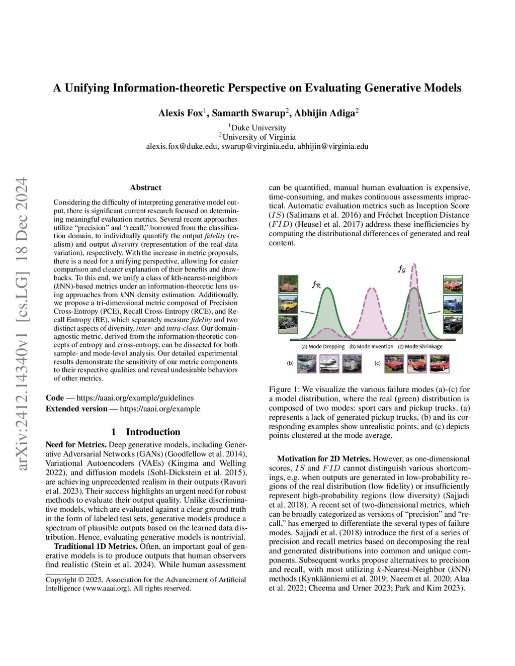Considering the difficulty of interpreting generative model output, there is significant current research focused on determining meaningful evaluation metrics. Several recent approaches utilize "precision" and "recall," borrowed from the classification domain, to individually quantify the output fidelity (realism) and output diversity (representation of the real data variation), respectively. With the increase in metric proposals, there is a need for a unifying perspective, allowing for easier comparison and clearer explanation of their benefits and drawbacks. To this end, we unify a class of kth-nearest-neighbors (kNN)-based metrics under an information-theoretic lens using approaches from kNN density estimation. Additionally, we propose a tri-dimensional metric composed of Precision Cross-Entropy (PCE), Recall Cross-Entropy (RCE), and Recall Entropy (RE), which separately measure fidelity and two distinct aspects of diversity, inter- and intra-class. Our domain-agnostic metric, derived from the information-theoretic concepts of entropy and cross-entropy, can be dissected for both sample- and mode-level analysis. Our detailed experimental results demonstrate the sensitivity of our metric components to their respective qualities and reveal undesirable behaviors of other metrics.