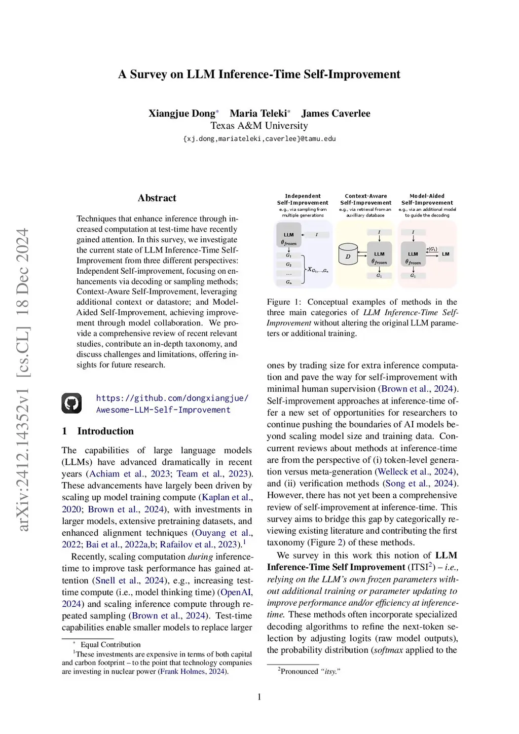 Techniques that enhance inference through increased computation at test-time have recently gained attention. In this survey, we investigate the current state of LLM Inference-Time Self-Improvement from three different perspectives: Independent Self-improvement, focusing on enhancements via decoding or sampling methods; Context-Aware Self-Improvement, leveraging additional context or datastore; and Model-Aided Self-Improvement, achieving improvement through model collaboration. We provide a comprehensive review of recent relevant studies, contribute an in-depth taxonomy, and discuss challenges and limitations, offering insights for future research.