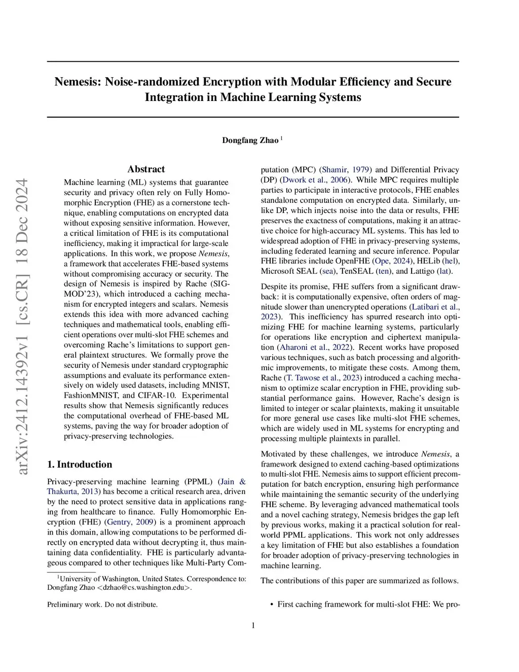 Machine learning (ML) systems that guarantee security and privacy often rely on Fully Homomorphic Encryption (FHE) as a cornerstone technique, enabling computations on encrypted data without exposing sensitive information. However, a critical limitation of FHE is its computational inefficiency, making it impractical for large-scale applications. In this work, we propose \textit{Nemesis}, a framework that accelerates FHE-based systems without compromising accuracy or security. The design of Nemesis is inspired by Rache (SIGMOD'23), which introduced a caching mechanism for encrypted integers and scalars. Nemesis extends this idea with more advanced caching techniques and mathematical tools, enabling efficient operations over multi-slot FHE schemes and overcoming Rache's limitations to support general plaintext structures. We formally prove the security of Nemesis under standard cryptographic assumptions and evaluate its performance extensively on widely used datasets, including MNIST, FashionMNIST, and CIFAR-10. Experimental results show that Nemesis significantly reduces the computational overhead of FHE-based ML systems, paving the way for broader adoption of privacy-preserving technologies.
