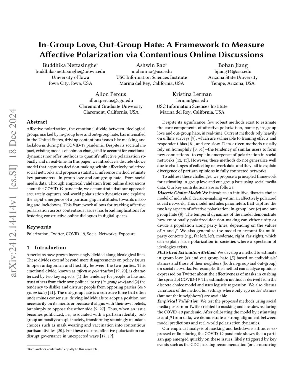 Affective polarization, the emotional divide between ideological groups marked by in-group love and out-group hate, has intensified in the United States, driving contentious issues like masking and lockdowns during the COVID-19 pandemic. Despite its societal impact, existing models of opinion change fail to account for emotional dynamics nor offer methods to quantify affective polarization robustly and in real-time. In this paper, we introduce a discrete choice model that captures decision-making within affectively polarized social networks and propose a statistical inference method estimate key parameters -- in-group love and out-group hate -- from social media data. Through empirical validation from online discussions about the COVID-19 pandemic, we demonstrate that our approach accurately captures real-world polarization dynamics and explains the rapid emergence of a partisan gap in attitudes towards masking and lockdowns. This framework allows for tracking affective polarization across contentious issues has broad implications for fostering constructive online dialogues in digital spaces.