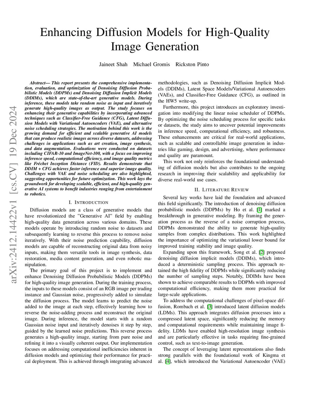 This report presents the comprehensive implementation, evaluation, and optimization of Denoising Diffusion Probabilistic Models (DDPMs) and Denoising Diffusion Implicit Models (DDIMs), which are state-of-the-art generative models. During inference, these models take random noise as input and iteratively generate high-quality images as output. The study focuses on enhancing their generative capabilities by incorporating advanced techniques such as Classifier-Free Guidance (CFG), Latent Diffusion Models with Variational Autoencoders (VAE), and alternative noise scheduling strategies. The motivation behind this work is the growing demand for efficient and scalable generative AI models that can produce realistic images across diverse datasets, addressing challenges in applications such as art creation, image synthesis, and data augmentation. Evaluations were conducted on datasets including CIFAR-10 and ImageNet-100, with a focus on improving inference speed, computational efficiency, and image quality metrics like Frechet Inception Distance (FID). Results demonstrate that DDIM + CFG achieves faster inference and superior image quality. Challenges with VAE and noise scheduling are also highlighted, suggesting opportunities for future optimization. This work lays the groundwork for developing scalable, efficient, and high-quality generative AI systems to benefit industries ranging from entertainment to robotics.