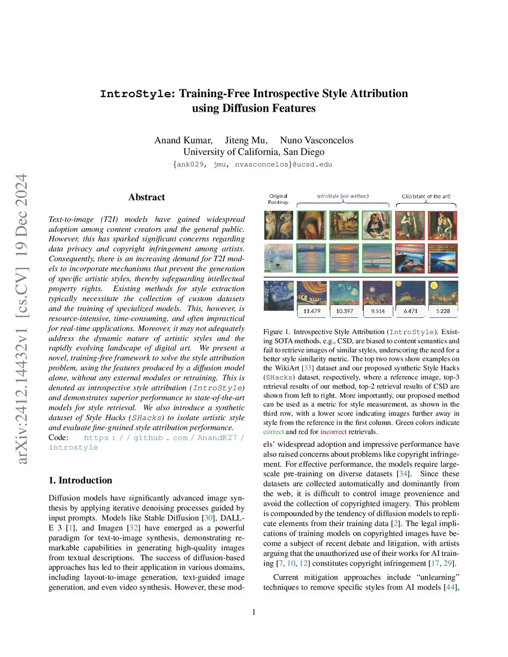 Text-to-image (T2I) models have recently gained widespread adoption. This has spurred concerns about safeguarding intellectual property rights and an increasing demand for mechanisms that prevent the generation of specific artistic styles. Existing methods for style extraction typically necessitate the collection of custom datasets and the training of specialized models. This, however, is resource-intensive, time-consuming, and often impractical for real-time applications. We present a novel, training-free framework to solve the style attribution problem, using the features produced by a diffusion model alone, without any external modules or retraining. This is denoted as Introspective Style attribution (IntroStyle) and is shown to have superior performance to state-of-the-art models for style attribution. We also introduce a synthetic dataset of Artistic Style Split (ArtSplit) to isolate artistic style and evaluate fine-grained style attribution performance. Our experimental results on WikiArt and DomainNet datasets show that \ours is robust to the dynamic nature of artistic styles, outperforming existing methods by a wide margin.