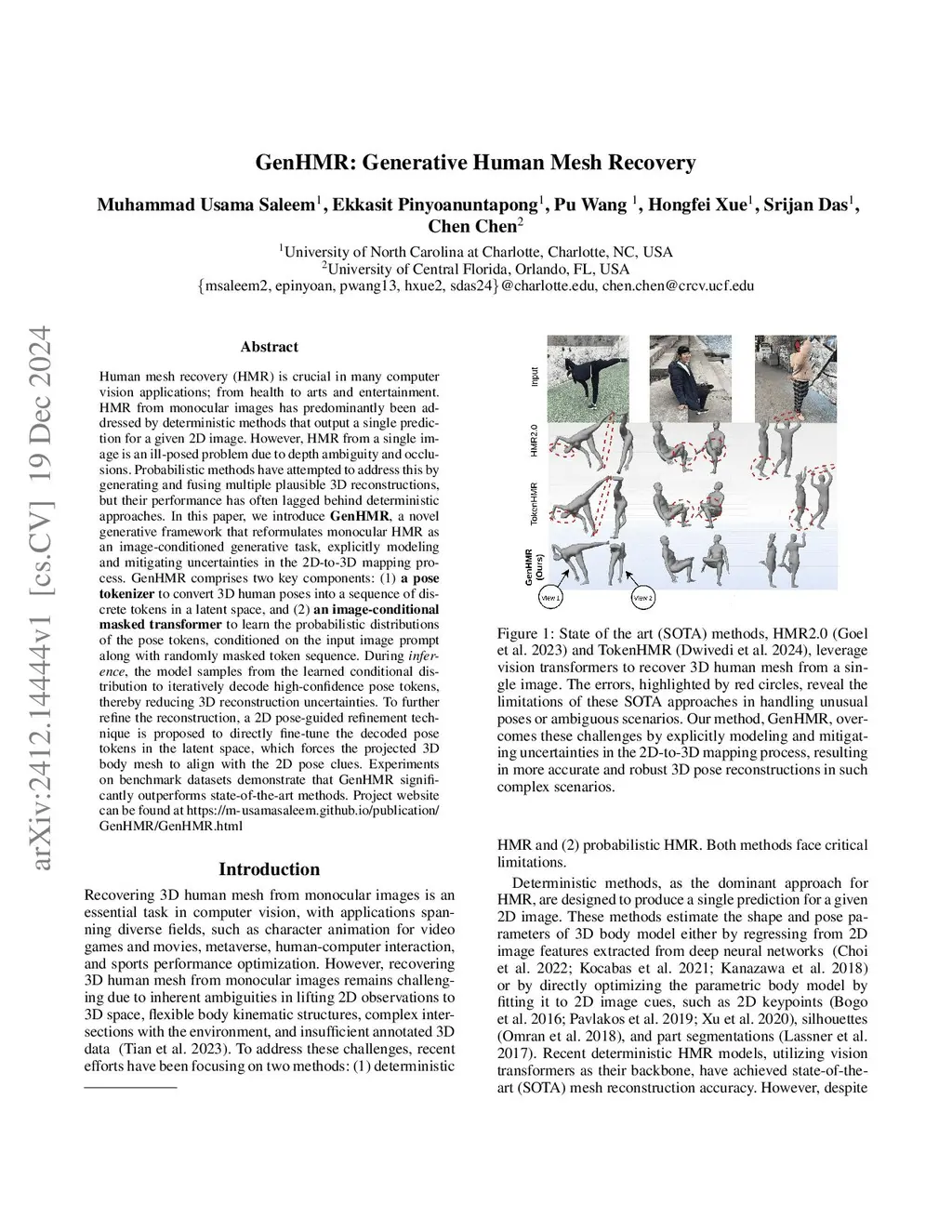 Human mesh recovery (HMR) is crucial in many computer vision applications; from health to arts and entertainment. HMR from monocular images has predominantly been addressed by deterministic methods that output a single prediction for a given 2D image. However, HMR from a single image is an ill-posed problem due to depth ambiguity and occlusions. Probabilistic methods have attempted to address this by generating and fusing multiple plausible 3D reconstructions, but their performance has often lagged behind deterministic approaches. In this paper, we introduce GenHMR, a novel generative framework that reformulates monocular HMR as an image-conditioned generative task, explicitly modeling and mitigating uncertainties in the 2D-to-3D mapping process. GenHMR comprises two key components: (1) a pose tokenizer to convert 3D human poses into a sequence of discrete tokens in a latent space, and (2) an image-conditional masked transformer to learn the probabilistic distributions of the pose tokens, conditioned on the input image prompt along with randomly masked token sequence. During inference, the model samples from the learned conditional distribution to iteratively decode high-confidence pose tokens, thereby reducing 3D reconstruction uncertainties. To further refine the reconstruction, a 2D pose-guided refinement technique is proposed to directly fine-tune the decoded pose tokens in the latent space, which forces the projected 3D body mesh to align with the 2D pose clues. Experiments on benchmark datasets demonstrate that GenHMR significantly outperforms state-of-the-art methods. Project website can be found at https://m-usamasaleem.github.io/publication/GenHMR/GenHMR.html