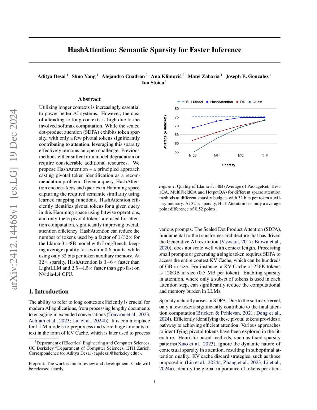 Leveraging long contexts is crucial for advanced AI systems, but attention computation poses a scalability challenge. While scaled dot-product attention (SDPA) exhibits token sparsity, i.e. only a few pivotal tokens significantly contribute to output, exploiting this sparsity remains challenging. Existing methods either suffer from quality degradation or require substantial additional resources. We show that identifying pivotal tokens is a Maximum Inner Product Search (MIPS) problem. However, existing MIPS solutions are not well-suited for SDPA, as they are not GPU-friendly and often underperform due to the separated query and key distributions. This paper introduces HashAttention, framing pivotal token identification as a recommendation problem. Given a query, HashAttention encodes keys and queries in Hamming space, capturing the required semantic similarity, using learned mapping functions. HashAttention efficiently identifies pivotal tokens for a given query using bitwise operations and computes attention using only these tokens, improving the overall attention efficiency. Trained on generic data, HashAttention reduces tokens used by up to with minimal quality loss, requiring only 32 bits of auxiliary memory per token. Sparsity can be further improved to through task-specific fine-tuning. On A100 GPU, at sparsity, incorporating HashAttention reduces attention latency by up to in GPT-FAST and in FlashDecode, and achieves up to higher throughput for GPT-FAST.