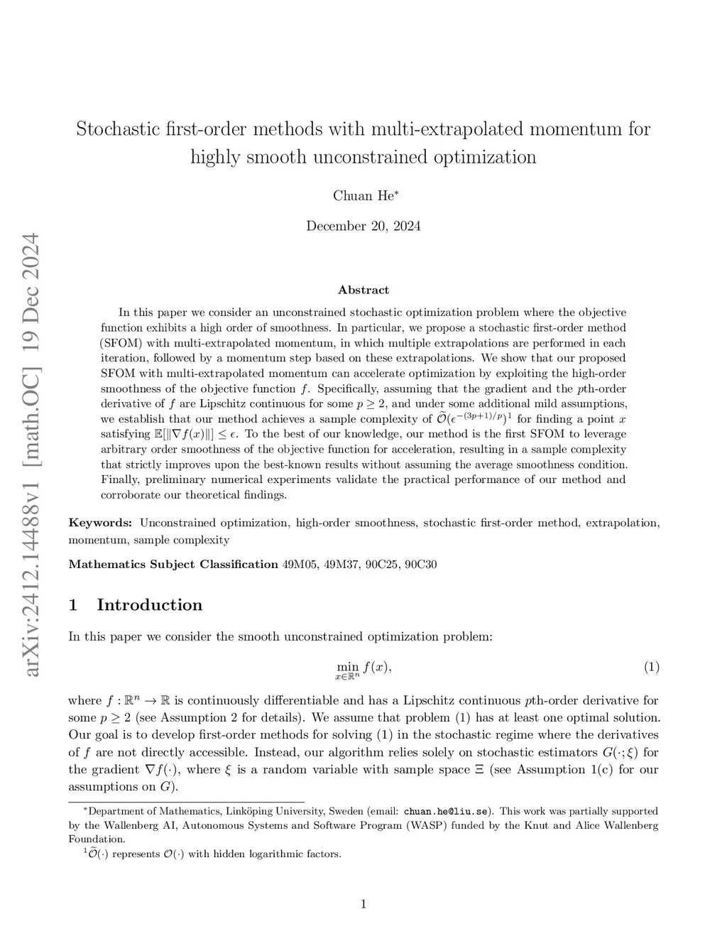 A stochastic first-order method with multi-extrapolated momentum for highly smooth unconstrained optimization