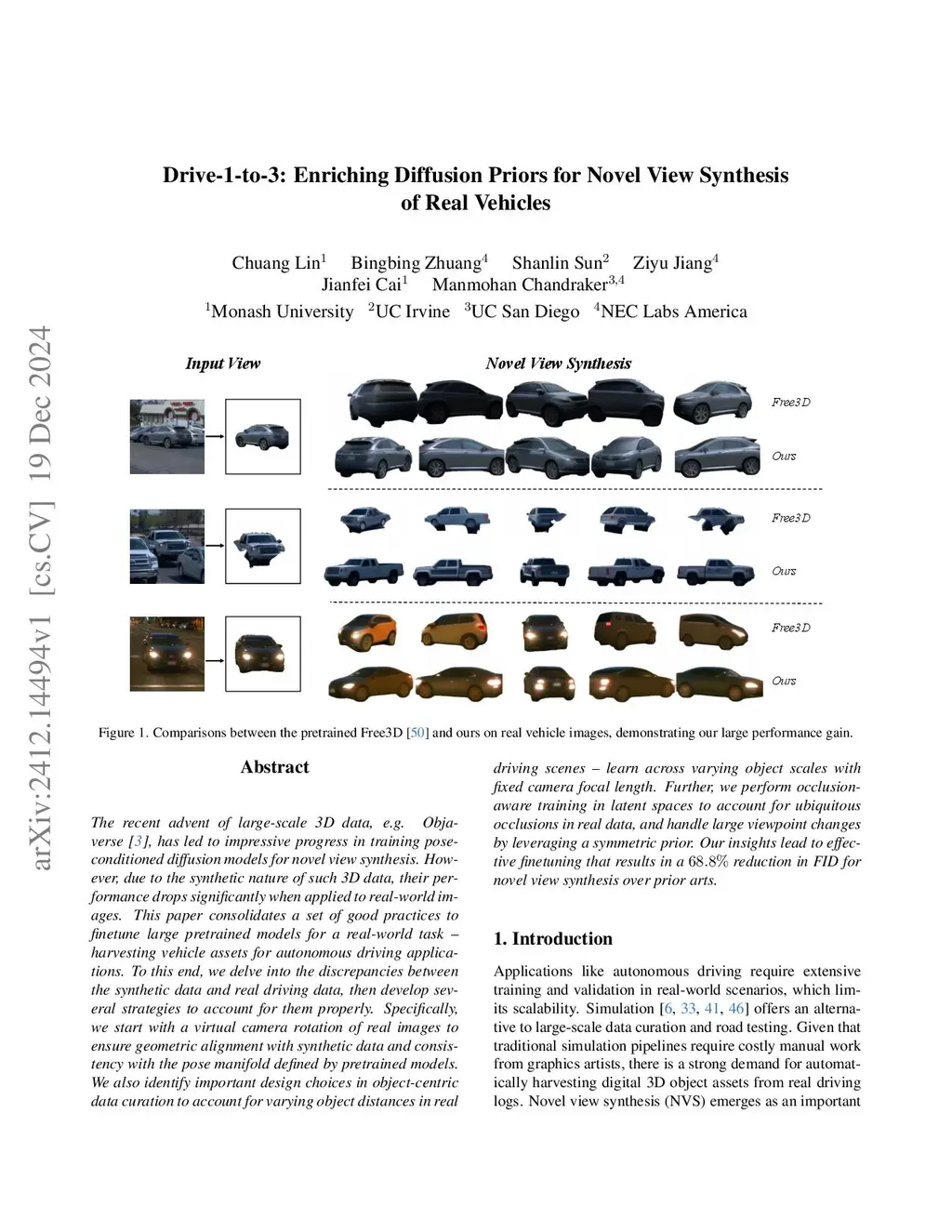 Drive-1-to-3: Enriching Diffusion Priors for Novel View Synthesis of