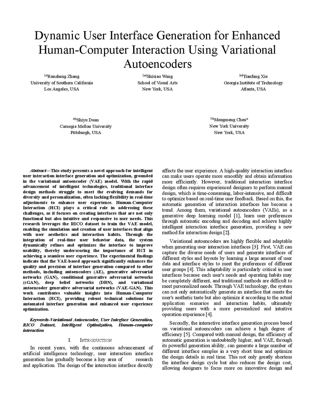 This study presents a novel approach for intelligent user interaction interface generation and optimization, grounded in the variational autoencoder (VAE) model. With the rapid advancement of intelligent technologies, traditional interface design methods struggle to meet the evolving demands for diversity and personalization, often lacking flexibility in real-time adjustments to enhance the user experience. Human-Computer Interaction (HCI) plays a critical role in addressing these challenges by focusing on creating interfaces that are functional, intuitive, and responsive to user needs. This research leverages the RICO dataset to train the VAE model, enabling the simulation and creation of user interfaces that align with user aesthetics and interaction habits. By integrating real-time user behavior data, the system dynamically refines and optimizes the interface, improving usability and underscoring the importance of HCI in achieving a seamless user experience. Experimental findings indicate that the VAE-based approach significantly enhances the quality and precision of interface generation compared to other methods, including autoencoders (AE), generative adversarial networks (GAN), conditional GANs (cGAN), deep belief networks (DBN), and VAE-GAN. This work contributes valuable insights into HCI, providing robust technical solutions for automated interface generation and enhanced user experience optimization.