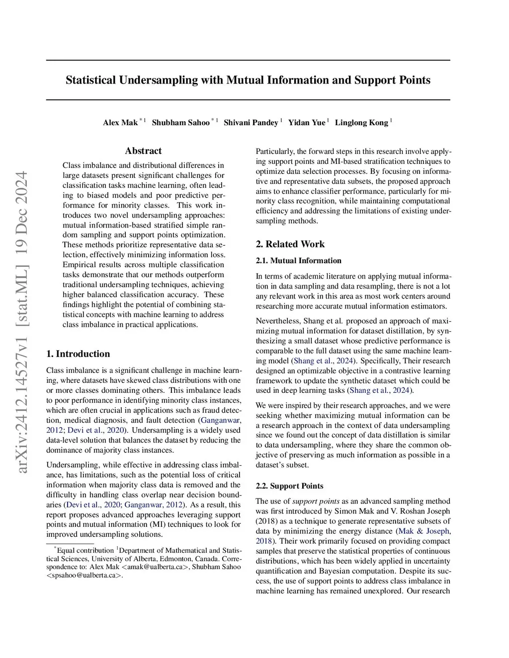 Class imbalance and distributional differences in large datasets present significant challenges for classification tasks machine learning, often leading to biased models and poor predictive performance for minority classes. This work introduces two novel undersampling approaches: mutual information-based stratified simple random sampling and support points optimization. These methods prioritize representative data selection, effectively minimizing information loss. Empirical results across multiple classification tasks demonstrate that our methods outperform traditional undersampling techniques, achieving higher balanced classification accuracy. These findings highlight the potential of combining statistical concepts with machine learning to address class imbalance in practical applications.