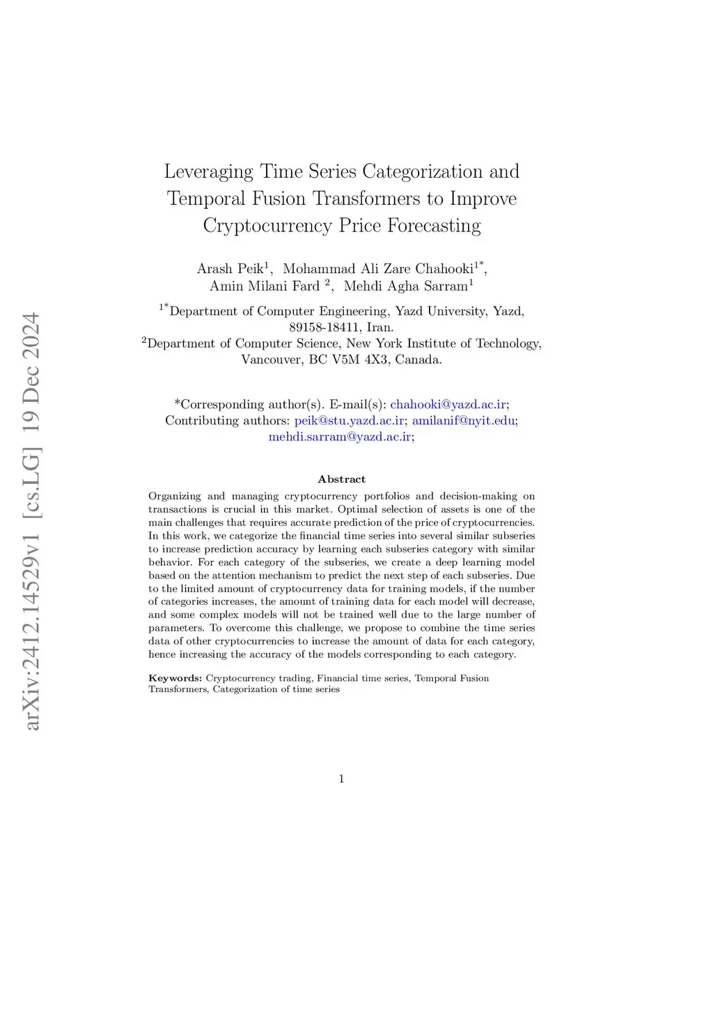 Organizing and managing cryptocurrency portfolios and decision-making on transactions is crucial in this market. Optimal selection of assets is one of the main challenges that requires accurate prediction of the price of cryptocurrencies. In this work, we categorize the financial time series into several similar subseries to increase prediction accuracy by learning each subseries category with similar behavior. For each category of the subseries, we create a deep learning model based on the attention mechanism to predict the next step of each subseries. Due to the limited amount of cryptocurrency data for training models, if the number of categories increases, the amount of training data for each model will decrease, and some complex models will not be trained well due to the large number of parameters. To overcome this challenge, we propose to combine the time series data of other cryptocurrencies to increase the amount of data for each category, hence increasing the accuracy of the models corresponding to each category.