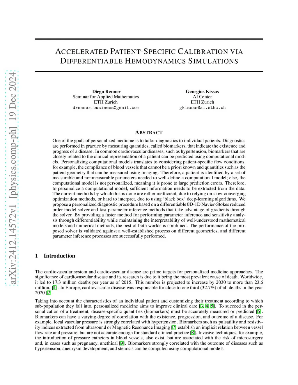 One of the goals of personalized medicine is to tailor diagnostics to individual patients. Diagnostics are performed in practice by measuring quantities, called biomarkers, that indicate the existence and progress of a disease. In common cardiovascular diseases, such as hypertension, biomarkers that are closely related to the clinical representation of a patient can be predicted using computational models. Personalizing computational models translates to considering patient-specific flow conditions, for example, the compliance of blood vessels that cannot be a priori known and quantities such as the patient geometry that can be measured using imaging. Therefore, a patient is identified by a set of measurable and nonmeasurable parameters needed to well-define a computational model; else, the computational model is not personalized, meaning it is prone to large prediction errors. Therefore, to personalize a computational model, sufficient information needs to be extracted from the data. The current methods by which this is done are either inefficient, due to relying on slow-converging optimization methods, or hard to interpret, due to using `black box` deep-learning algorithms. We propose a personalized diagnostic procedure based on a differentiable 0D-1D Navier-Stokes reduced order model solver and fast parameter inference methods that take advantage of gradients through the solver. By providing a faster method for performing parameter inference and sensitivity analysis through differentiability while maintaining the interpretability of well-understood mathematical models and numerical methods, the best of both worlds is combined. The performance of the proposed solver is validated against a well-established process on different geometries, and different parameter inference processes are successfully performed.