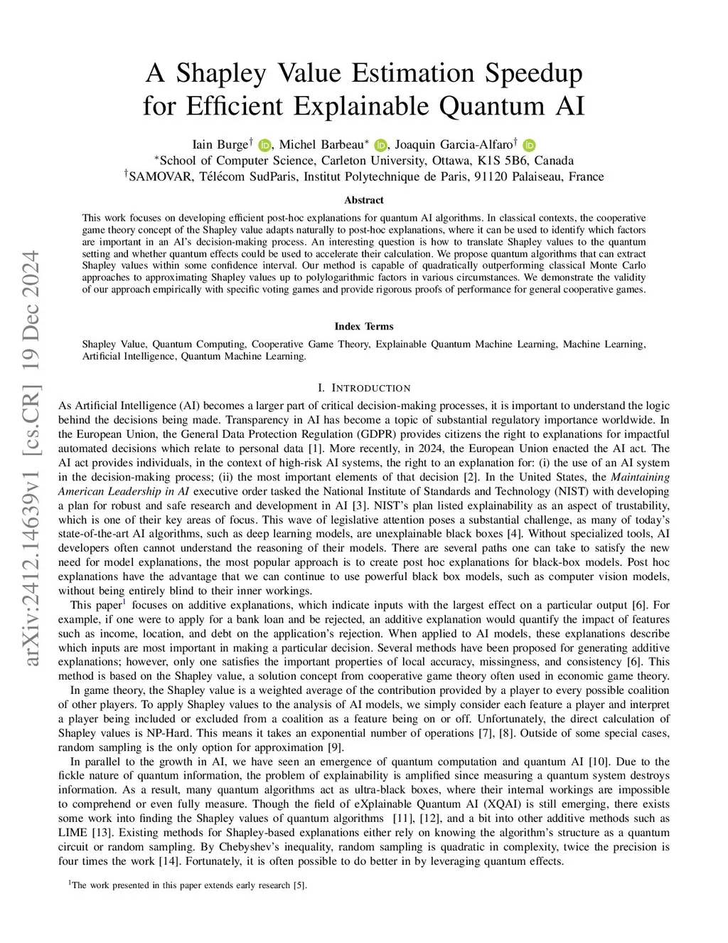 This work focuses on developing efficient post-hoc explanations for quantum AI algorithms. In classical contexts, the cooperative game theory concept of the Shapley value adapts naturally to post-hoc explanations, where it can be used to identify which factors are important in an AI's decision-making process. An interesting question is how to translate Shapley values to the quantum setting and whether quantum effects could be used to accelerate their calculation. We propose quantum algorithms that can extract Shapley values within some confidence interval. Our method is capable of quadratically outperforming classical Monte Carlo approaches to approximating Shapley values up to polylogarithmic factors in various circumstances. We demonstrate the validity of our approach empirically with specific voting games and provide rigorous proofs of performance for general cooperative games.