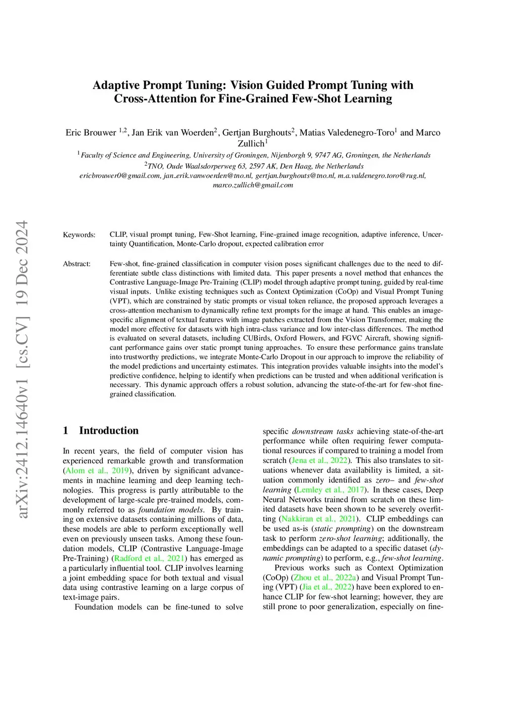 Few-shot, fine-grained classification in computer vision poses significant challenges due to the need to differentiate subtle class distinctions with limited data. This paper presents a novel method that enhances the Contrastive Language-Image Pre-Training (CLIP) model through adaptive prompt tuning, guided by real-time visual inputs. Unlike existing techniques such as Context Optimization (CoOp) and Visual Prompt Tuning (VPT), which are constrained by static prompts or visual token reliance, the proposed approach leverages a cross-attention mechanism to dynamically refine text prompts for the image at hand. This enables an image-specific alignment of textual features with image patches extracted from the Vision Transformer, making the model more effective for datasets with high intra-class variance and low inter-class differences. The method is evaluated on several datasets, including CUBirds, Oxford Flowers, and FGVC Aircraft, showing significant performance gains over static prompt tuning approaches. To ensure these performance gains translate into trustworthy predictions, we integrate Monte-Carlo Dropout in our approach to improve the reliability of the model predictions and uncertainty estimates. This integration provides valuable insights into the model's predictive confidence, helping to identify when predictions can be trusted and when additional verification is necessary. This dynamic approach offers a robust solution, advancing the state-of-the-art for few-shot fine-grained classification.