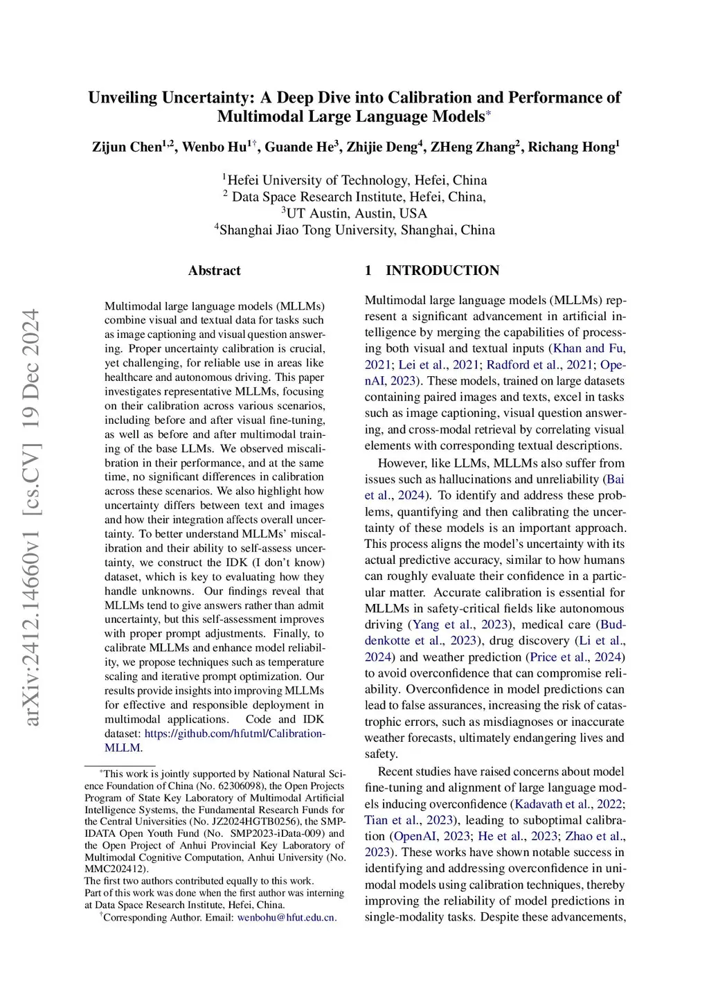 Multimodal large language models (MLLMs) combine visual and textual data for tasks such as image captioning and visual question answering. Proper uncertainty calibration is crucial, yet challenging, for reliable use in areas like healthcare and autonomous driving. This paper investigates representative MLLMs, focusing on their calibration across various scenarios, including before and after visual fine-tuning, as well as before and after multimodal training of the base LLMs. We observed miscalibration in their performance, and at the same time, no significant differences in calibration across these scenarios. We also highlight how uncertainty differs between text and images and how their integration affects overall uncertainty. To better understand MLLMs' miscalibration and their ability to self-assess uncertainty, we construct the IDK (I don't know) dataset, which is key to evaluating how they handle unknowns. Our findings reveal that MLLMs tend to give answers rather than admit uncertainty, but this self-assessment improves with proper prompt adjustments. Finally, to calibrate MLLMs and enhance model reliability, we propose techniques such as temperature scaling and iterative prompt optimization. Our results provide insights into improving MLLMs for effective and responsible deployment in multimodal applications. Code and IDK dataset: https://github.com/hfutml/Calibration-MLLM.