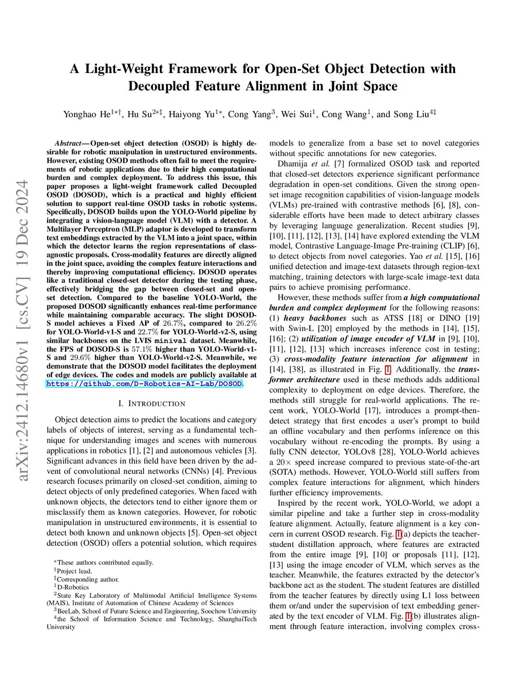 Open-set object detection (OSOD) is highly desirable for robotic manipulation in unstructured environments. However, existing OSOD methods often fail to meet the requirements of robotic applications due to their high computational burden and complex deployment. To address this issue, this paper proposes a light-weight framework called Decoupled OSOD (DOSOD), which is a practical and highly efficient solution to support real-time OSOD tasks in robotic systems. Specifically, DOSOD builds upon the YOLO-World pipeline by integrating a vision-language model (VLM) with a detector. A Multilayer Perceptron (MLP) adaptor is developed to transform text embeddings extracted by the VLM into a joint space, within which the detector learns the region representations of class-agnostic proposals. Cross-modality features are directly aligned in the joint space, avoiding the complex feature interactions and thereby improving computational efficiency. DOSOD operates like a traditional closed-set detector during the testing phase, effectively bridging the gap between closed-set and open-set detection. Compared to the baseline YOLO-World, the proposed DOSOD significantly enhances real-time performance while maintaining comparable accuracy. The slight DOSOD-S model achieves a Fixed AP of , compared to for YOLO-World-v1-S and for YOLO-World-v2-S, using similar backbones on the LVIS minival dataset. Meanwhile, the FPS of DOSOD-S is higher than YOLO-World-v1-S and higher than YOLO-World-v2-S. Meanwhile, we demonstrate that the DOSOD model facilitates the deployment of edge devices. The codes and models are publicly available at https://github.com/D-Robotics-AI-Lab/DOSOD.