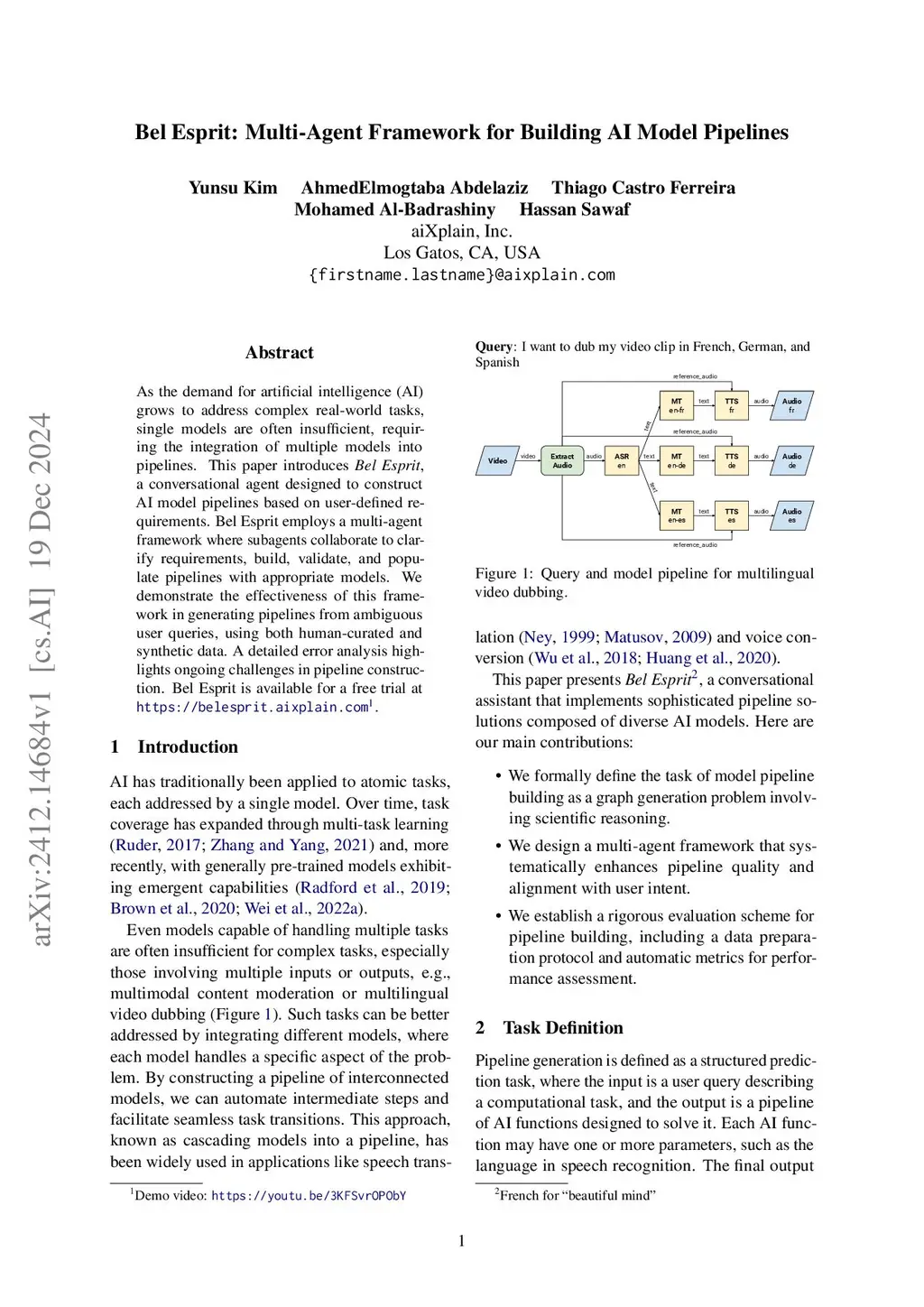 As the demand for artificial intelligence (AI) grows to address complex real-world tasks, single models are often insufficient, requiring the integration of multiple models into pipelines. This paper introduces Bel Esprit, a conversational agent designed to construct AI model pipelines based on user-defined requirements. Bel Esprit employs a multi-agent framework where subagents collaborate to clarify requirements, build, validate, and populate pipelines with appropriate models. We demonstrate the effectiveness of this framework in generating pipelines from ambiguous user queries, using both human-curated and synthetic data. A detailed error analysis highlights ongoing challenges in pipeline construction. Bel Esprit is available for a free trial atthis https URL.