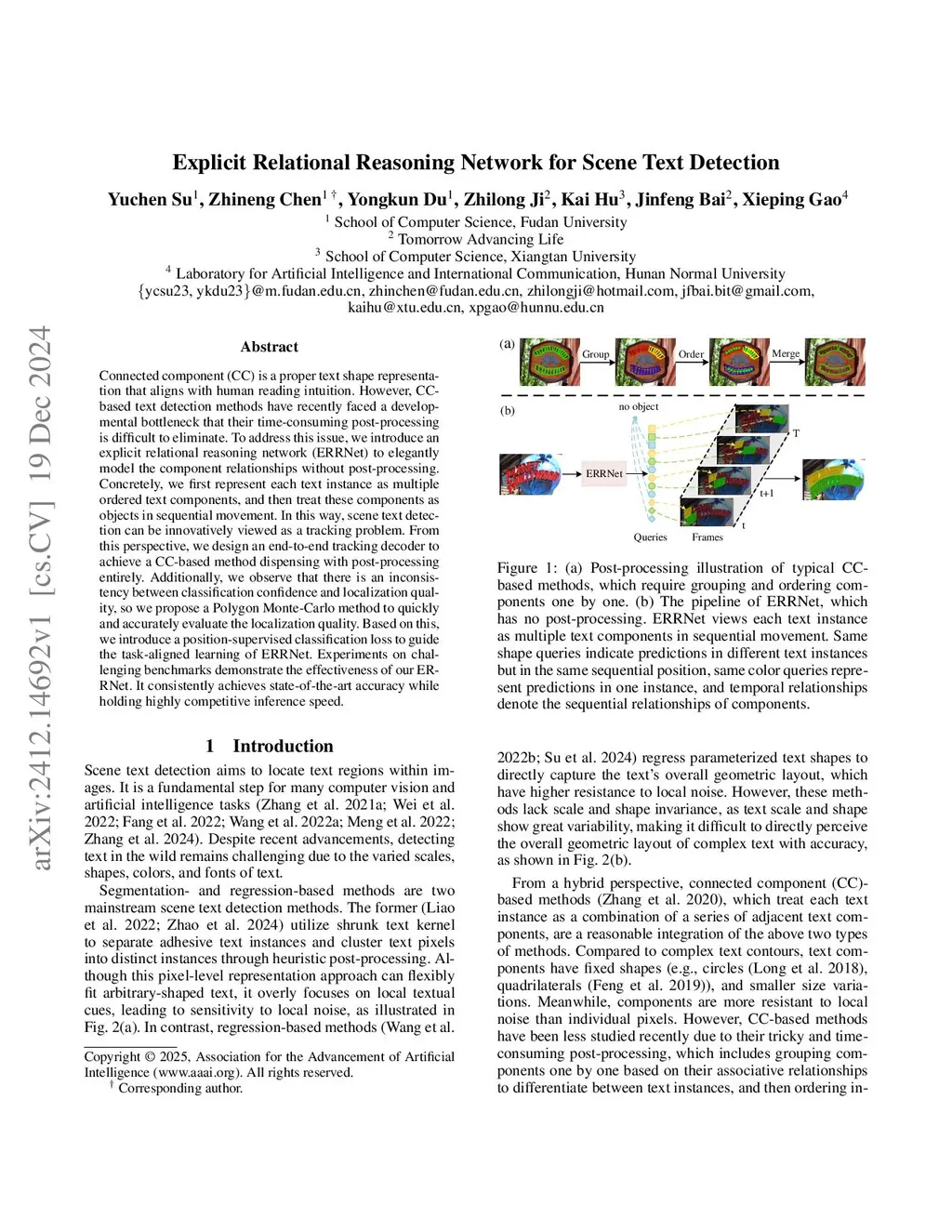 Connected component (CC) is a proper text shape representation that aligns with human reading intuition. However, CC-based text detection methods have recently faced a developmental bottleneck that their time-consuming post-processing is difficult to eliminate. To address this issue, we introduce an explicit relational reasoning network (ERRNet) to elegantly model the component relationships without post-processing. Concretely, we first represent each text instance as multiple ordered text components, and then treat these components as objects in sequential movement. In this way, scene text detection can be innovatively viewed as a tracking problem. From this perspective, we design an end-to-end tracking decoder to achieve a CC-based method dispensing with post-processing entirely. Additionally, we observe that there is an inconsistency between classification confidence and localization quality, so we propose a Polygon Monte-Carlo method to quickly and accurately evaluate the localization quality. Based on this, we introduce a position-supervised classification loss to guide the task-aligned learning of ERRNet. Experiments on challenging benchmarks demonstrate the effectiveness of our ERRNet. It consistently achieves state-of-the-art accuracy while holding highly competitive inference speed.