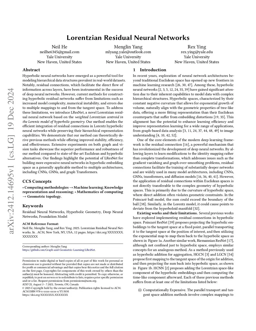 Hyperbolic neural networks have emerged as a powerful tool for modeling hierarchical data structures prevalent in real-world datasets. Notably, residual connections, which facilitate the direct flow of information across layers, have been instrumental in the success of deep neural networks. However, current methods for constructing hyperbolic residual networks suffer from limitations such as increased model complexity, numerical instability, and errors due to multiple mappings to and from the tangent space. To address these limitations, we introduce LResNet, a novel Lorentzian residual neural network based on the weighted Lorentzian centroid in the Lorentz model of hyperbolic geometry. Our method enables the efficient integration of residual connections in Lorentz hyperbolic neural networks while preserving their hierarchical representation capabilities. We demonstrate that our method can theoretically derive previous methods while offering improved stability, efficiency, and effectiveness. Extensive experiments on both graph and vision tasks showcase the superior performance and robustness of our method compared to state-of-the-art Euclidean and hyperbolic alternatives. Our findings highlight the potential of LResNet for building more expressive neural networks in hyperbolic embedding space as a generally applicable method to multiple architectures, including CNNs, GNNs, and graph Transformers.