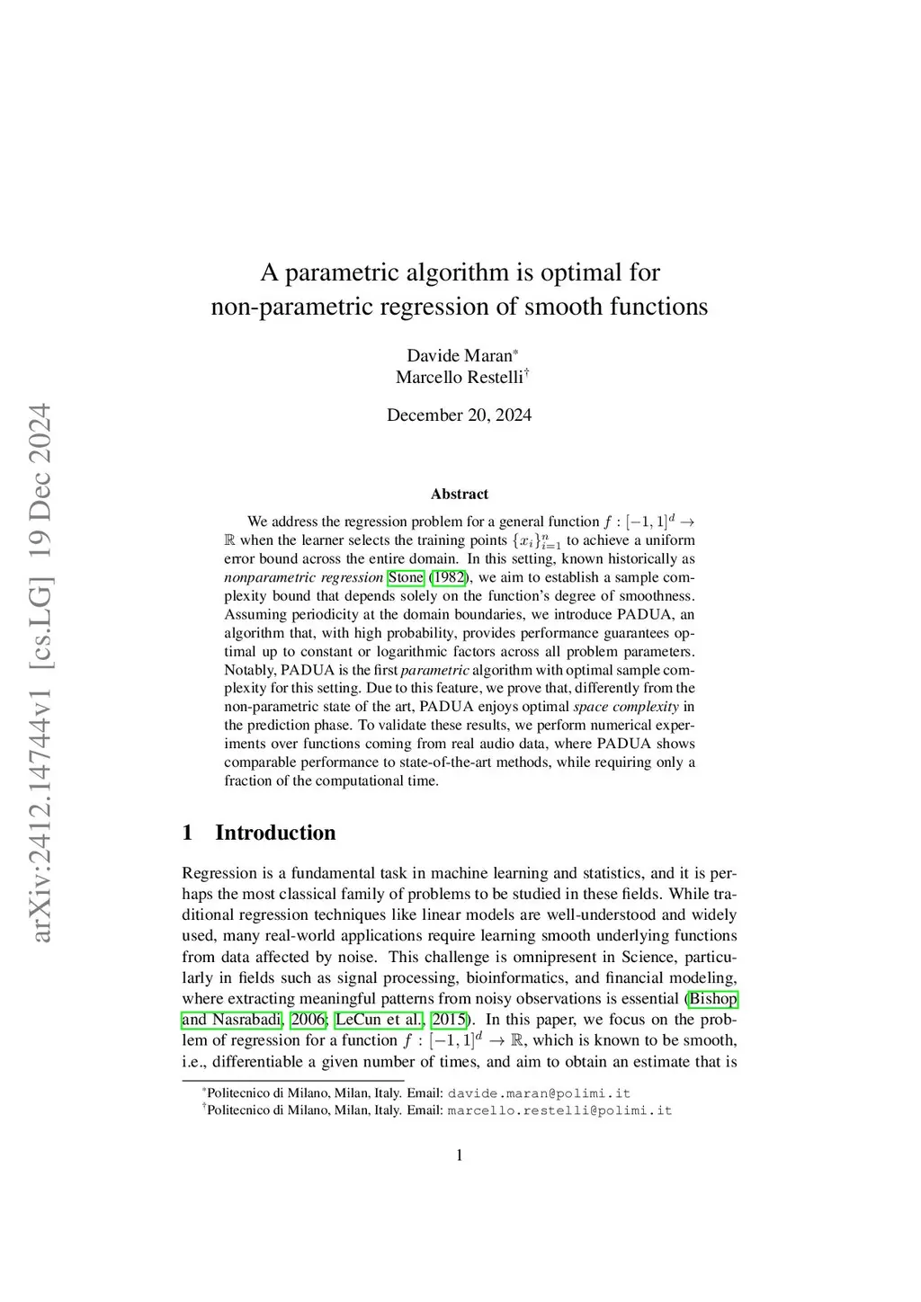 We address the regression problem for a general function when the learner selects the training points to achieve a uniform error bound across the entire domain. In this setting, known historically as nonparametric regression, we aim to establish a sample complexity bound that depends solely on the function's degree of smoothness. Assuming periodicity at the domain boundaries, we introduce PADUA, an algorithm that, with high probability, provides performance guarantees optimal up to constant or logarithmic factors across all problem parameters. Notably, PADUA is the first parametric algorithm with optimal sample complexity for this setting. Due to this feature, we prove that, differently from the non-parametric state of the art, PADUA enjoys optimal space complexity in the prediction phase. To validate these results, we perform numerical experiments over functions coming from real audio data, where PADUA shows comparable performance to state-of-the-art methods, while requiring only a fraction of the computational time.