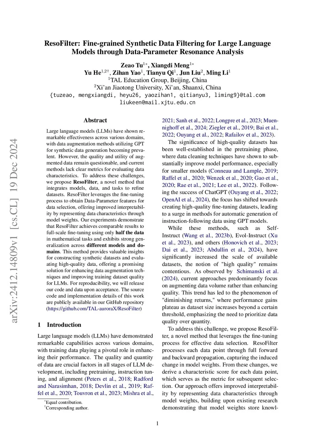 Large language models (LLMs) have shown remarkable effectiveness across various domains, with data augmentation methods utilizing GPT for synthetic data generation becoming prevalent. However, the quality and utility of augmented data remain questionable, and current methods lack clear metrics for evaluating data characteristics. To address these challenges, we propose ResoFilter, a novel method that integrates models, data, and tasks to refine datasets. ResoFilter leverages the fine-tuning process to obtain Data-Parameter features for data selection, offering improved interpretability by representing data characteristics through model weights. Our experiments demonstrate that ResoFilter achieves comparable results to full-scale fine-tuning using only half the data in mathematical tasks and exhibits strong generalization across different models and domains. This method provides valuable insights for constructing synthetic datasets and evaluating high-quality data, offering a promising solution for enhancing data augmentation techniques and improving training dataset quality for LLMs. For reproducibility, we will release our code and data upon acceptance.