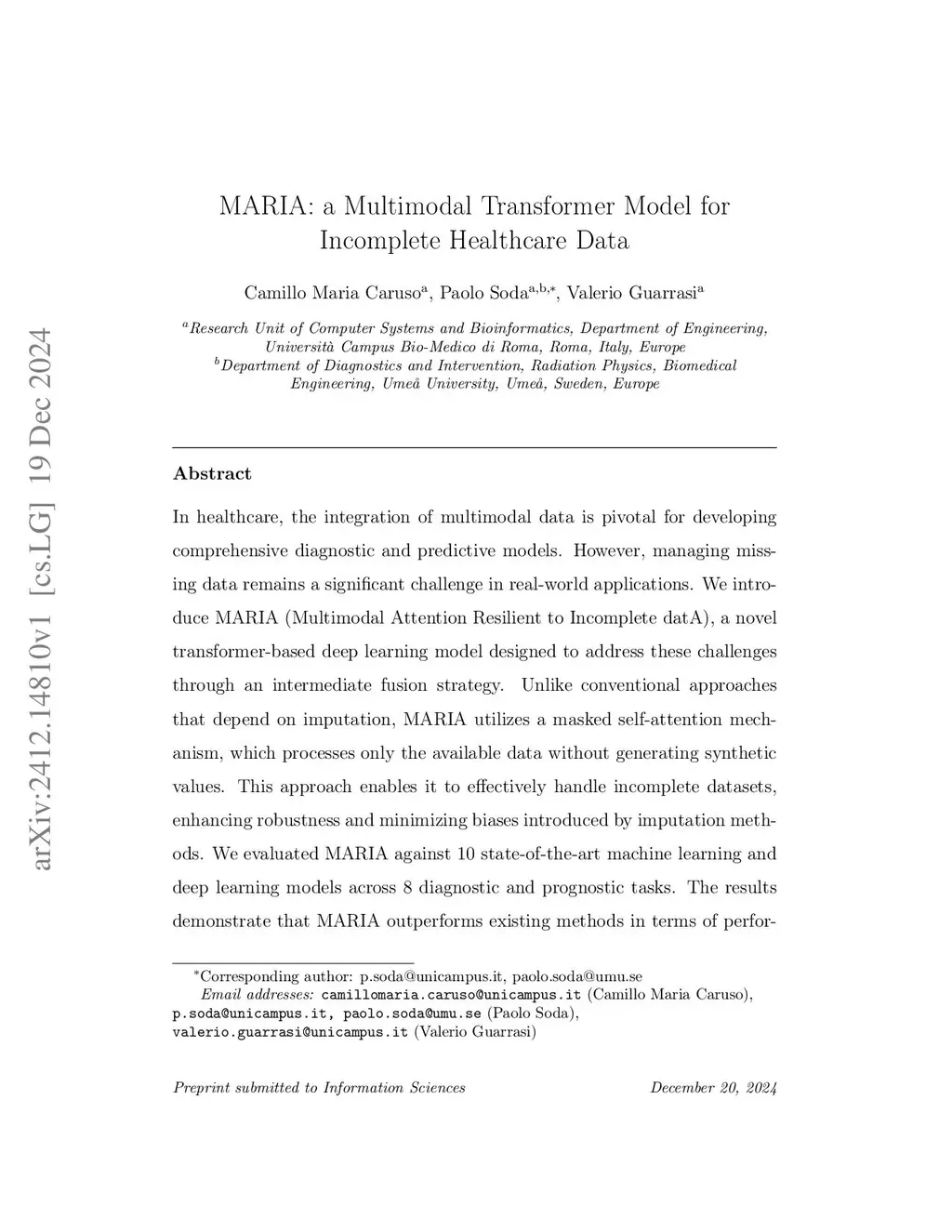 MARIA: a Multimodal Transformer Model for Incomplete Healthcare Data