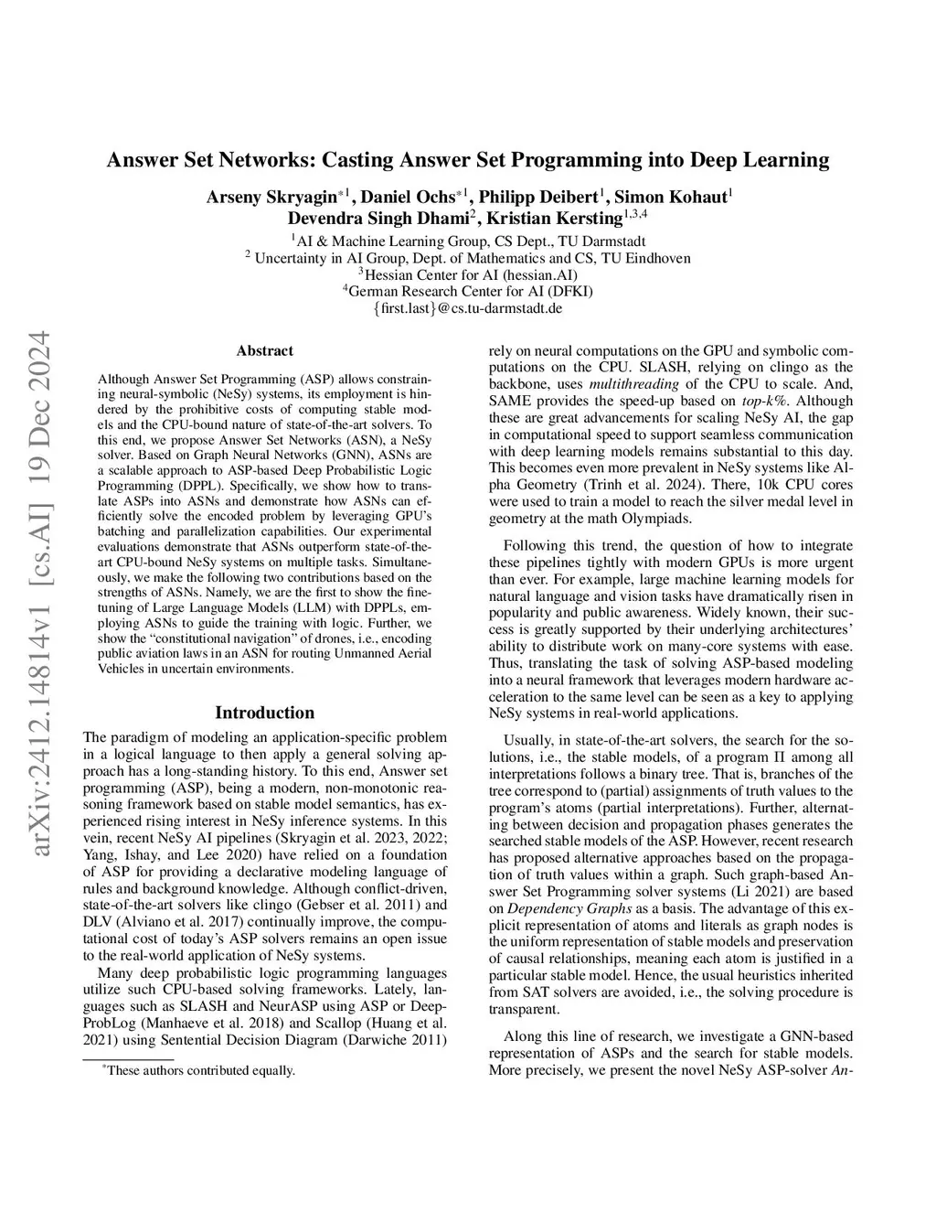 Although Answer Set Programming (ASP) allows constraining neural-symbolic (NeSy) systems, its employment is hindered by the prohibitive costs of computing stable models and the CPU-bound nature of state-of-the-art solvers. To this end, we propose Answer Set Networks (ASN), a NeSy solver. Based on Graph Neural Networks (GNN), ASNs are a scalable approach to ASP-based Deep Probabilistic Logic Programming (DPPL). Specifically, we show how to translate ASPs into ASNs and demonstrate how ASNs can efficiently solve the encoded problem by leveraging GPU's batching and parallelization capabilities. Our experimental evaluations demonstrate that ASNs outperform state-of-the-art CPU-bound NeSy systems on multiple tasks. Simultaneously, we make the following two contributions based on the strengths of ASNs. Namely, we are the first to show the finetuning of Large Language Models (LLM) with DPPLs, employing ASNs to guide the training with logic. Further, we show the "constitutional navigation" of drones, i.e., encoding public aviation laws in an ASN for routing Unmanned Aerial Vehicles in uncertain environments.