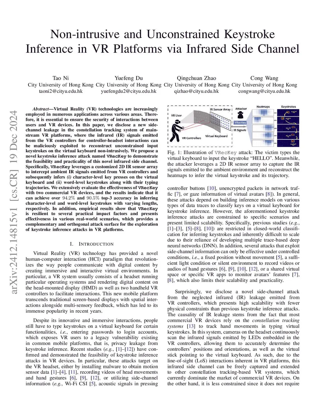 Virtual Reality (VR) technologies are increasingly employed in numerous applications across various areas. Therefore, it is essential to ensure the security of interactions between users and VR devices. In this paper, we disclose a new side-channel leakage in the constellation tracking system of mainstream VR platforms, where the infrared (IR) signals emitted from the VR controllers for controller-headset interactions can be maliciously exploited to reconstruct unconstrained input keystrokes on the virtual keyboard non-intrusively. We propose a novel keystroke inference attack named VRecKey to demonstrate the feasibility and practicality of this novel infrared side channel. Specifically, VRecKey leverages a customized 2D IR sensor array to intercept ambient IR signals emitted from VR controllers and subsequently infers (i) character-level key presses on the virtual keyboard and (ii) word-level keystrokes along with their typing trajectories. We extensively evaluate the effectiveness of VRecKey with two commercial VR devices, and the results indicate that it can achieve over 94.2% and 90.5% top-3 accuracy in inferring character-level and word-level keystrokes with varying lengths, respectively. In addition, empirical results show that VRecKey is resilient to several practical impact factors and presents effectiveness in various real-world scenarios, which provides a complementary and orthogonal attack surface for the exploration of keystroke inference attacks in VR platforms.