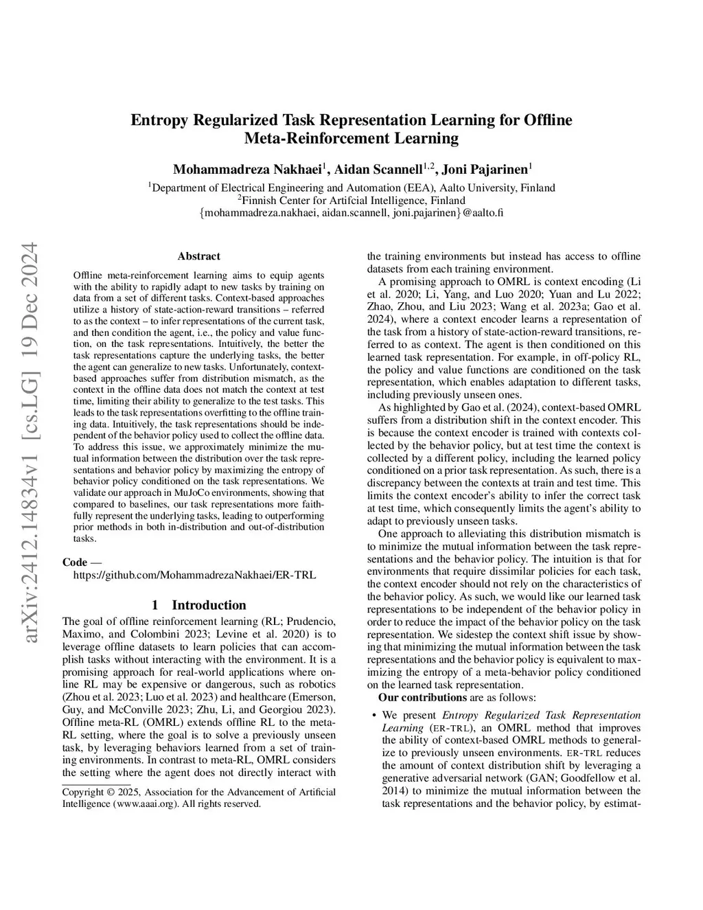 Entropy Regularized Task Representation Learning for Offline Meta-Reinforcement Learning