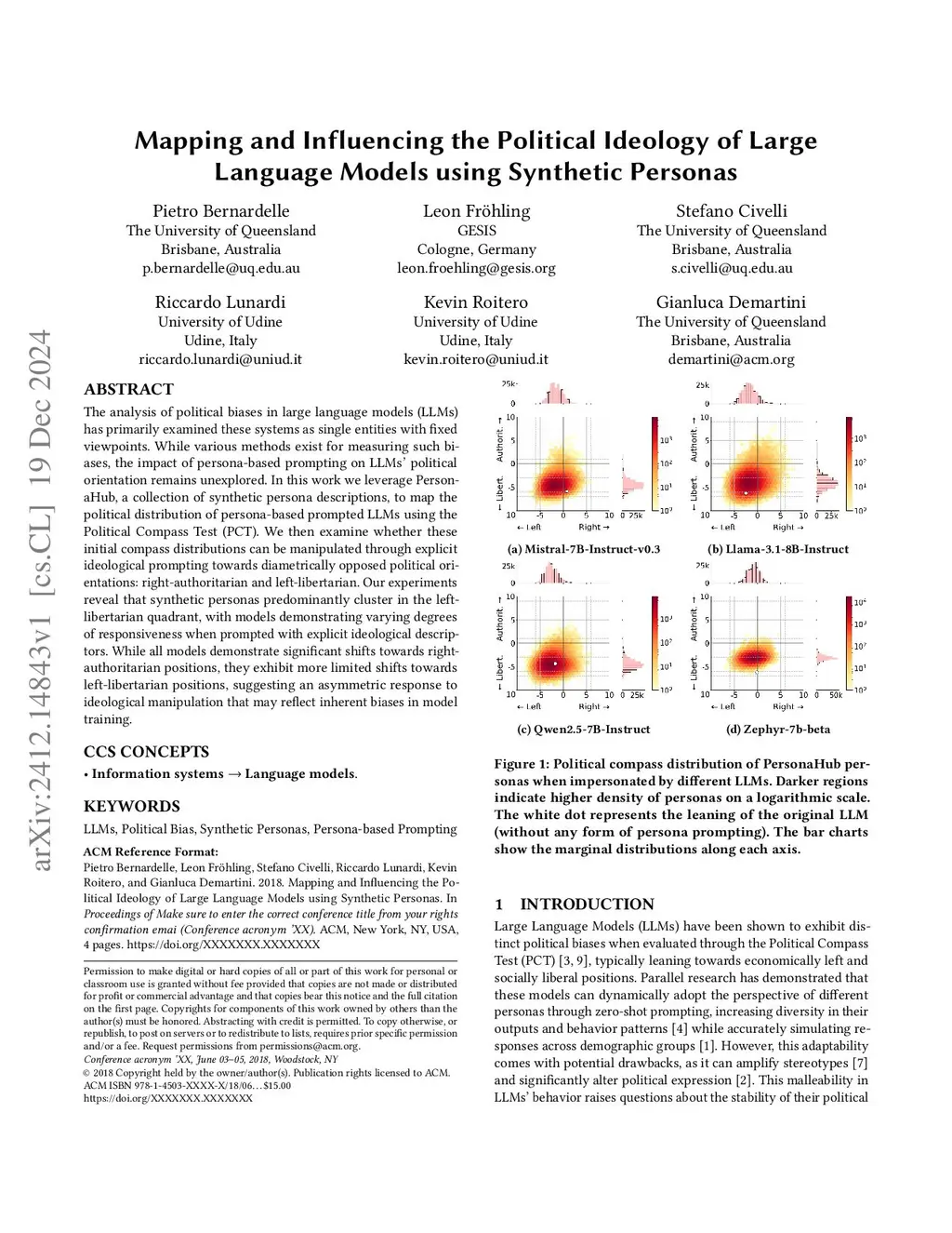 The analysis of political biases in large language models (LLMs) has primarily examined these systems as single entities with fixed viewpoints. While various methods exist for measuring such biases, the impact of persona-based prompting on LLMs' political orientation remains unexplored. In this work we leverage PersonaHub, a collection of synthetic persona descriptions, to map the political distribution of persona-based prompted LLMs using the Political Compass Test (PCT). We then examine whether these initial compass distributions can be manipulated through explicit ideological prompting towards diametrically opposed political orientations: right-authoritarian and left-libertarian. Our experiments reveal that synthetic personas predominantly cluster in the left-libertarian quadrant, with models demonstrating varying degrees of responsiveness when prompted with explicit ideological descriptors. While all models demonstrate significant shifts towards right-authoritarian positions, they exhibit more limited shifts towards left-libertarian positions, suggesting an asymmetric response to ideological manipulation that may reflect inherent biases in model training.