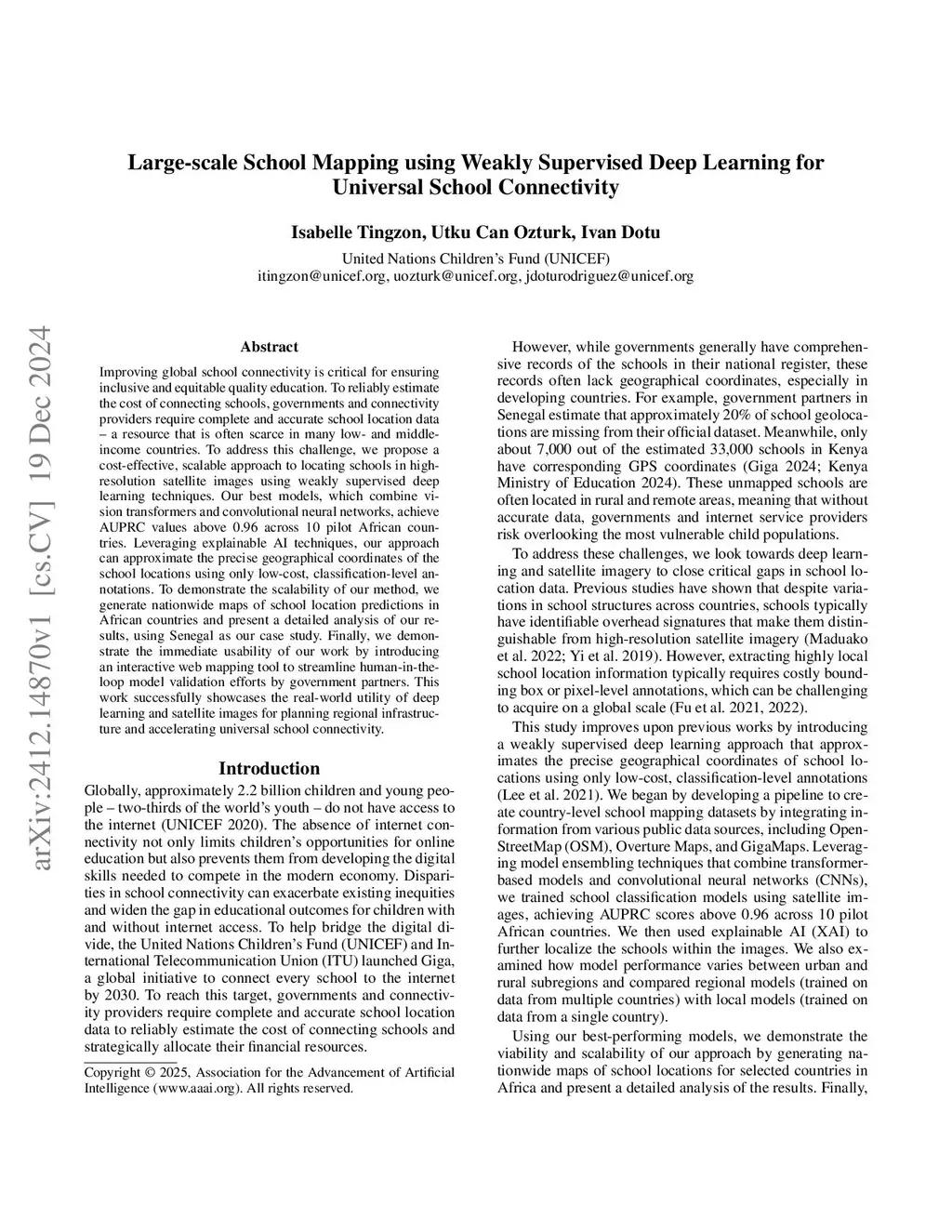 Improving global school connectivity is critical for ensuring inclusive and equitable quality education. To reliably estimate the cost of connecting schools, governments and connectivity providers require complete and accurate school location data - a resource that is often scarce in many low- and middle-income countries. To address this challenge, we propose a cost-effective, scalable approach to locating schools in high-resolution satellite images using weakly supervised deep learning techniques. Our best models, which combine vision transformers and convolutional neural networks, achieve AUPRC values above 0.96 across 10 pilot African countries. Leveraging explainable AI techniques, our approach can approximate the precise geographical coordinates of the school locations using only low-cost, classification-level annotations. To demonstrate the scalability of our method, we generate nationwide maps of school location predictions in African countries and present a detailed analysis of our results, using Senegal as our case study. Finally, we demonstrate the immediate usability of our work by introducing an interactive web mapping tool to streamline human-in-the-loop model validation efforts by government partners. This work successfully showcases the real-world utility of deep learning and satellite images for planning regional infrastructure and accelerating universal school connectivity.