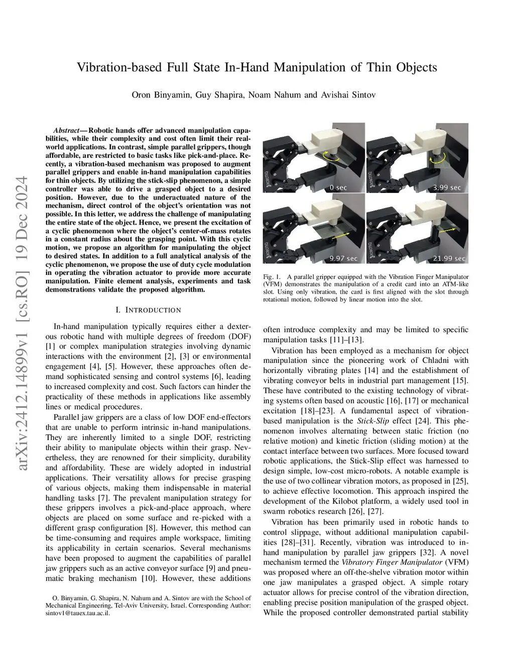 Vibration-based Full State In-Hand Manipulation of Thin Objects