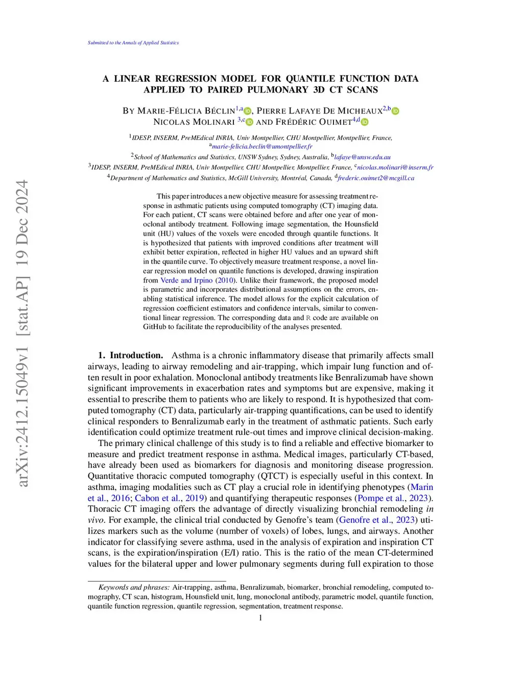 This paper introduces a new objective measure for assessing treatment response in asthmatic patients using computed tomography (CT) imaging data. For each patient, CT scans were obtained before and after one year of monoclonal antibody treatment. Following image segmentation, the Hounsfield unit (HU) values of the voxels were encoded through quantile functions. It is hypothesized that patients with improved conditions after treatment will exhibit better expiration, reflected in higher HU values and an upward shift in the quantile curve. To objectively measure treatment response, a novel linear regression model on quantile functions is developed, drawing inspiration from Verde and Irpino (2010). Unlike their framework, the proposed model is parametric and incorporates distributional assumptions on the errors, enabling statistical inference. The model allows for the explicit calculation of regression coefficient estimators and confidence intervals, similar to conventional linear regression. The corresponding data and R code are available on GitHub to facilitate the reproducibility of the analyses presented.