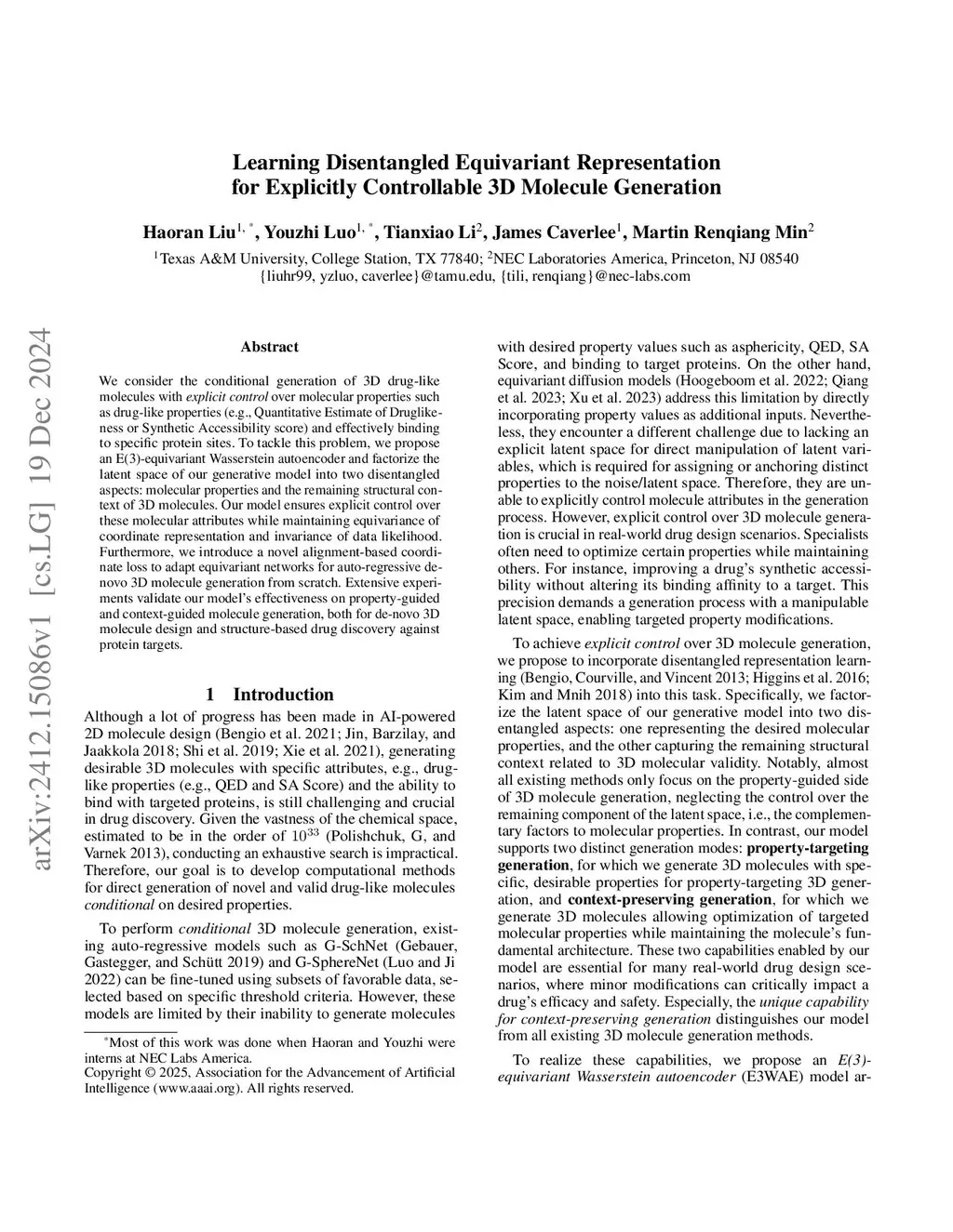 We consider the conditional generation of 3D drug-like molecules with \textit{explicit control} over molecular properties such as drug-like properties (e.g., Quantitative Estimate of Druglikeness or Synthetic Accessibility score) and effectively binding to specific protein sites. To tackle this problem, we propose an E(3)-equivariant Wasserstein autoencoder and factorize the latent space of our generative model into two disentangled aspects: molecular properties and the remaining structural context of 3D molecules. Our model ensures explicit control over these molecular attributes while maintaining equivariance of coordinate representation and invariance of data likelihood. Furthermore, we introduce a novel alignment-based coordinate loss to adapt equivariant networks for auto-regressive de-novo 3D molecule generation from scratch. Extensive experiments validate our model's effectiveness on property-guided and context-guided molecule generation, both for de-novo 3D molecule design and structure-based drug discovery against protein targets.