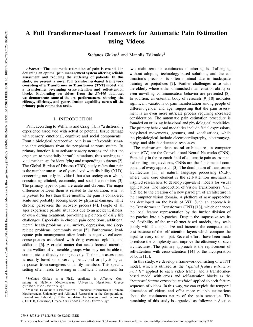 The automatic estimation of pain is essential in designing an optimal pain management system offering reliable assessment and reducing the suffering of patients. In this study, we present a novel full transformer-based framework consisting of a Transformer in Transformer (TNT) model and a Transformer leveraging cross-attention and self-attention blocks. Elaborating on videos from the BioVid database, we demonstrate state-of-the-art performances, showing the efficacy, efficiency, and generalization capability across all the primary pain estimation tasks.
