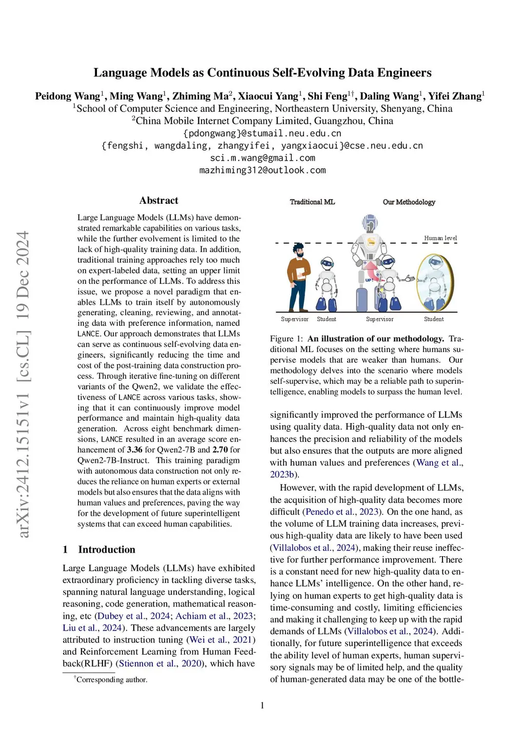 Large Language Models (LLMs) have demonstrated remarkable capabilities on various tasks, while the further evolvement is limited to the lack of high-quality training data. In addition, traditional training approaches rely too much on expert-labeled data, setting a ceiling on the performance of LLMs. To address this issue, we propose a novel paradigm named LANCE (LANguage models as Continuous self-Evolving data engineers) that enables LLMs to train themselves by autonomously generating, cleaning, reviewing, and annotating data with preference information. Our approach demonstrates that LLMs can serve as continuous self-evolving data engineers, significantly reducing the time and cost of the post-training data construction. Through iterative fine-tuning on Qwen2 series models, we validate the effectiveness of LANCE across various tasks, showing that it can maintain high-quality data generation and continuously improve model performance. Across multiple benchmark dimensions, LANCE results in an average score enhancement of 3.64 for Qwen2-7B and 1.75 for Qwen2-7B-Instruct. This training paradigm with autonomous data construction not only reduces the reliance on human experts or external models but also ensures that the data aligns with human preferences, paving the way for the development of future superintelligent systems that can exceed human capabilities. Codes are available at:this https URL.