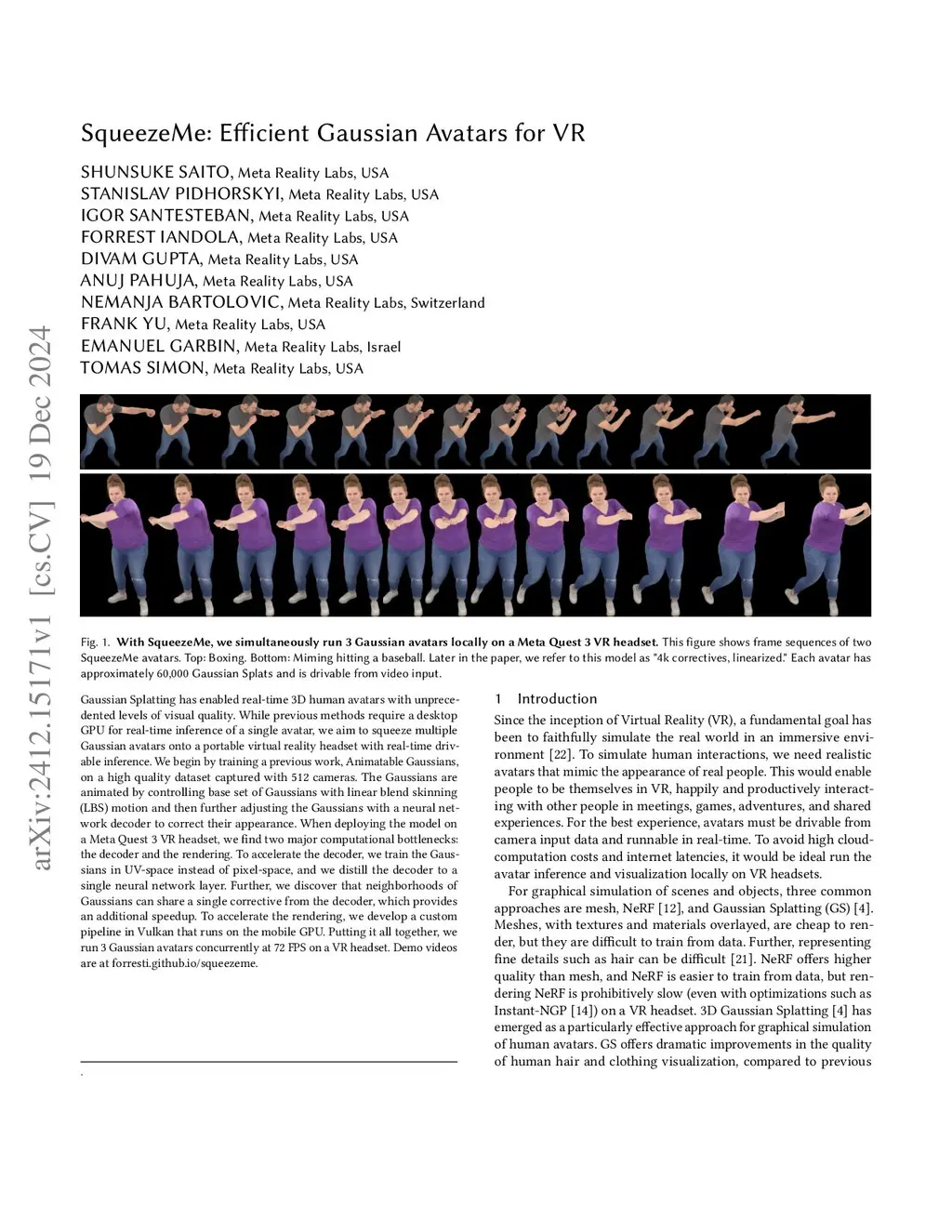 Gaussian-based human avatars have achieved an unprecedented level of visual fidelity. However, existing approaches based on high-capacity neural networks typically require a desktop GPU to achieve real-time performance for a single avatar, and it remains non-trivial to animate and render such avatars on mobile devices including a standalone VR headset due to substantially limited memory and computational bandwidth. In this paper, we present SqueezeMe, a simple and highly effective framework to convert high-fidelity 3D Gaussian full-body avatars into a lightweight representation that supports both animation and rendering with mobile-grade compute. Our key observation is that the decoding of pose-dependent Gaussian attributes from a neural network creates non-negligible memory and computational overhead. Inspired by blendshapes and linear pose correctives widely used in Computer Graphics, we address this by distilling the pose correctives learned with neural networks into linear layers. Moreover, we further reduce the parameters by sharing the correctives among nearby Gaussians. Combining them with a custom splatting pipeline based on Vulkan, we achieve, for the first time, simultaneous animation and rendering of 3 Gaussian avatars in real-time (72 FPS) on a Meta Quest 3 VR headset. Demo videos are available atthis https URL.