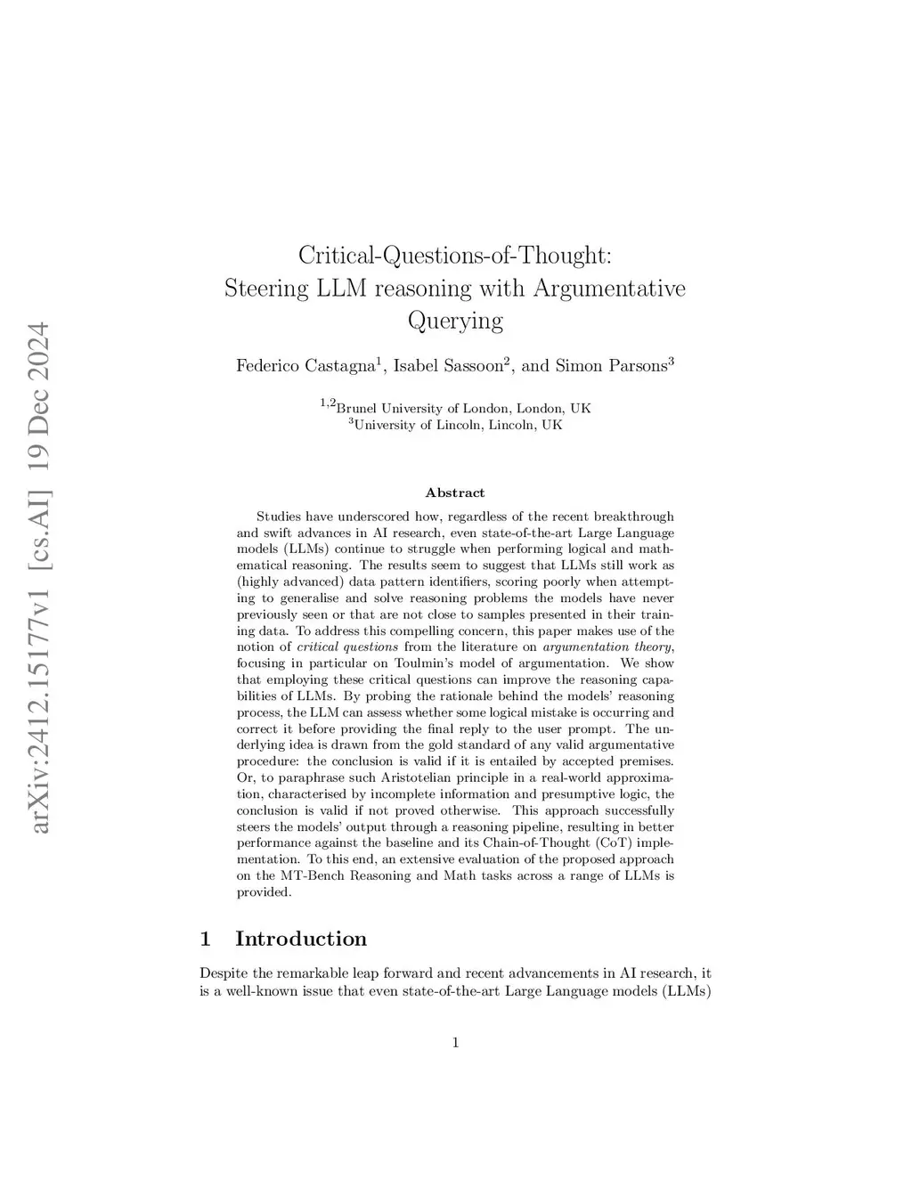 Studies have underscored how, regardless of the recent breakthrough and swift advances in AI research, even state-of-the-art Large Language models (LLMs) continue to struggle when performing logical and mathematical reasoning. The results seem to suggest that LLMs still work as (highly advanced) data pattern identifiers, scoring poorly when attempting to generalise and solve reasoning problems the models have never previously seen or that are not close to samples presented in their training data. To address this compelling concern, this paper makes use of the notion of critical questions from the literature on argumentation theory, focusing in particular on Toulmin's model of argumentation. We show that employing these critical questions can improve the reasoning capabilities of LLMs. By probing the rationale behind the models' reasoning process, the LLM can assess whether some logical mistake is occurring and correct it before providing the final reply to the user prompt. The underlying idea is drawn from the gold standard of any valid argumentative procedure: the conclusion is valid if it is entailed by accepted premises. Or, to paraphrase such Aristotelian principle in a real-world approximation, characterised by incomplete information and presumptive logic, the conclusion is valid if not proved otherwise. This approach successfully steers the models' output through a reasoning pipeline, resulting in better performance against the baseline and its Chain-of-Thought (CoT) implementation. To this end, an extensive evaluation of the proposed approach on the MT-Bench Reasoning and Math tasks across a range of LLMs is provided.