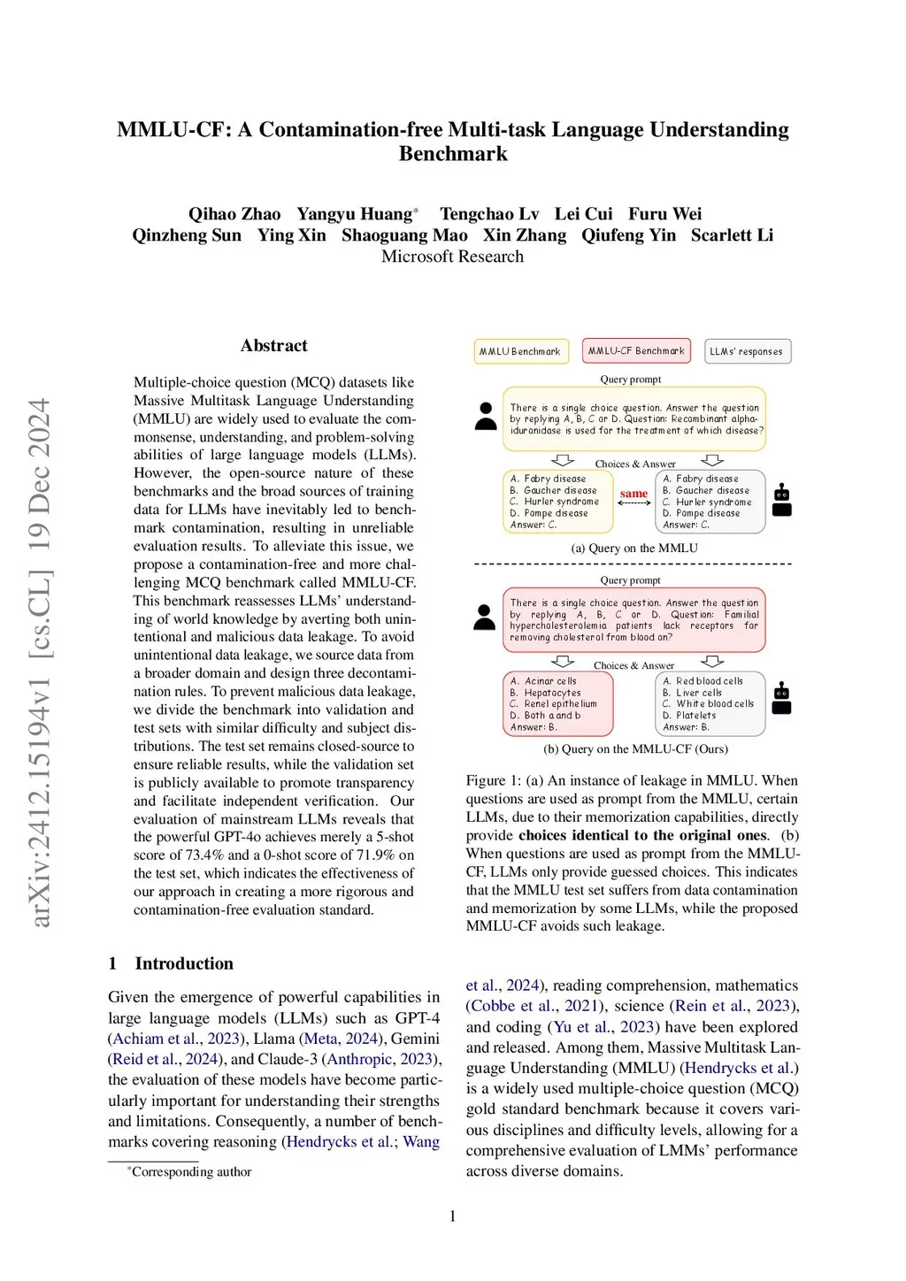Multiple-choice question (MCQ) datasets like Massive Multitask Language Understanding (MMLU) are widely used to evaluate the commonsense, understanding, and problem-solving abilities of large language models (LLMs). However, the open-source nature of these benchmarks and the broad sources of training data for LLMs have inevitably led to benchmark contamination, resulting in unreliable evaluation results. To alleviate this issue, we propose a contamination-free and more challenging MCQ benchmark called MMLU-CF. This benchmark reassesses LLMs' understanding of world knowledge by averting both unintentional and malicious data leakage. To avoid unintentional data leakage, we source data from a broader domain and design three decontamination rules. To prevent malicious data leakage, we divide the benchmark into validation and test sets with similar difficulty and subject distributions. The test set remains closed-source to ensure reliable results, while the validation set is publicly available to promote transparency and facilitate independent verification. Our evaluation of mainstream LLMs reveals that the powerful GPT-4o achieves merely a 5-shot score of 73.4% and a 0-shot score of 71.9% on the test set, which indicates the effectiveness of our approach in creating a more rigorous and contamination-free evaluation standard. The GitHub repository is available atthis https URLand the dataset refers tothis https URL.