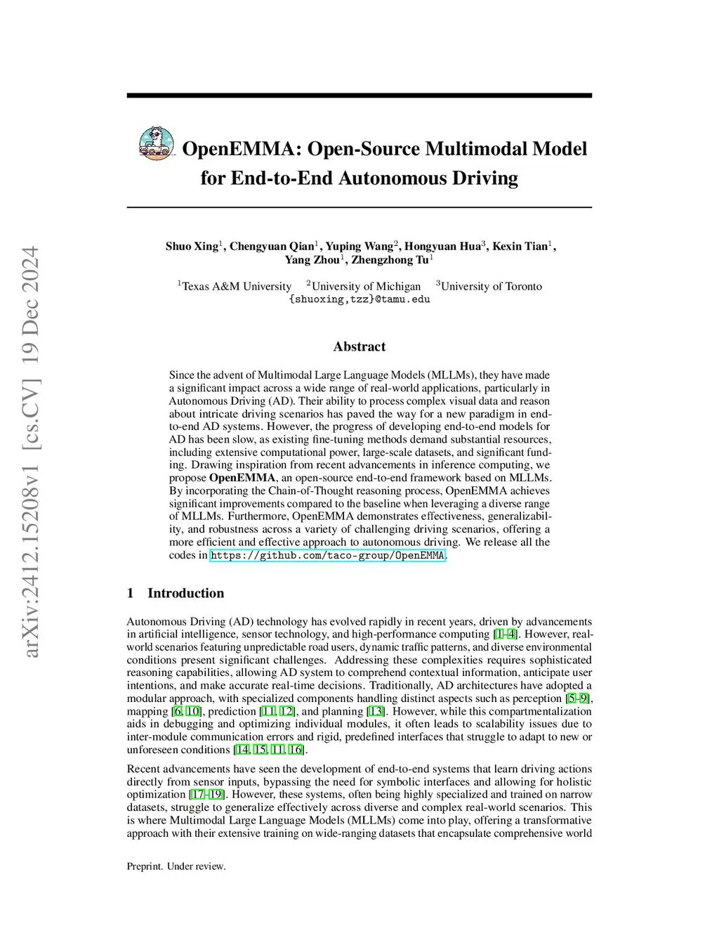 Since the advent of Multimodal Large Language Models (MLLMs), they have made a significant impact across a wide range of real-world applications, particularly in Autonomous Driving (AD). Their ability to process complex visual data and reason about intricate driving scenarios has paved the way for a new paradigm in end-to-end AD systems. However, the progress of developing end-to-end models for AD has been slow, as existing fine-tuning methods demand substantial resources, including extensive computational power, large-scale datasets, and significant funding. Drawing inspiration from recent advancements in inference computing, we propose OpenEMMA, an open-source end-to-end framework based on MLLMs. By incorporating the Chain-of-Thought reasoning process, OpenEMMA achieves significant improvements compared to the baseline when leveraging a diverse range of MLLMs. Furthermore, OpenEMMA demonstrates effectiveness, generalizability, and robustness across a variety of challenging driving scenarios, offering a more efficient and effective approach to autonomous driving. We release all the codes inthis https URL.